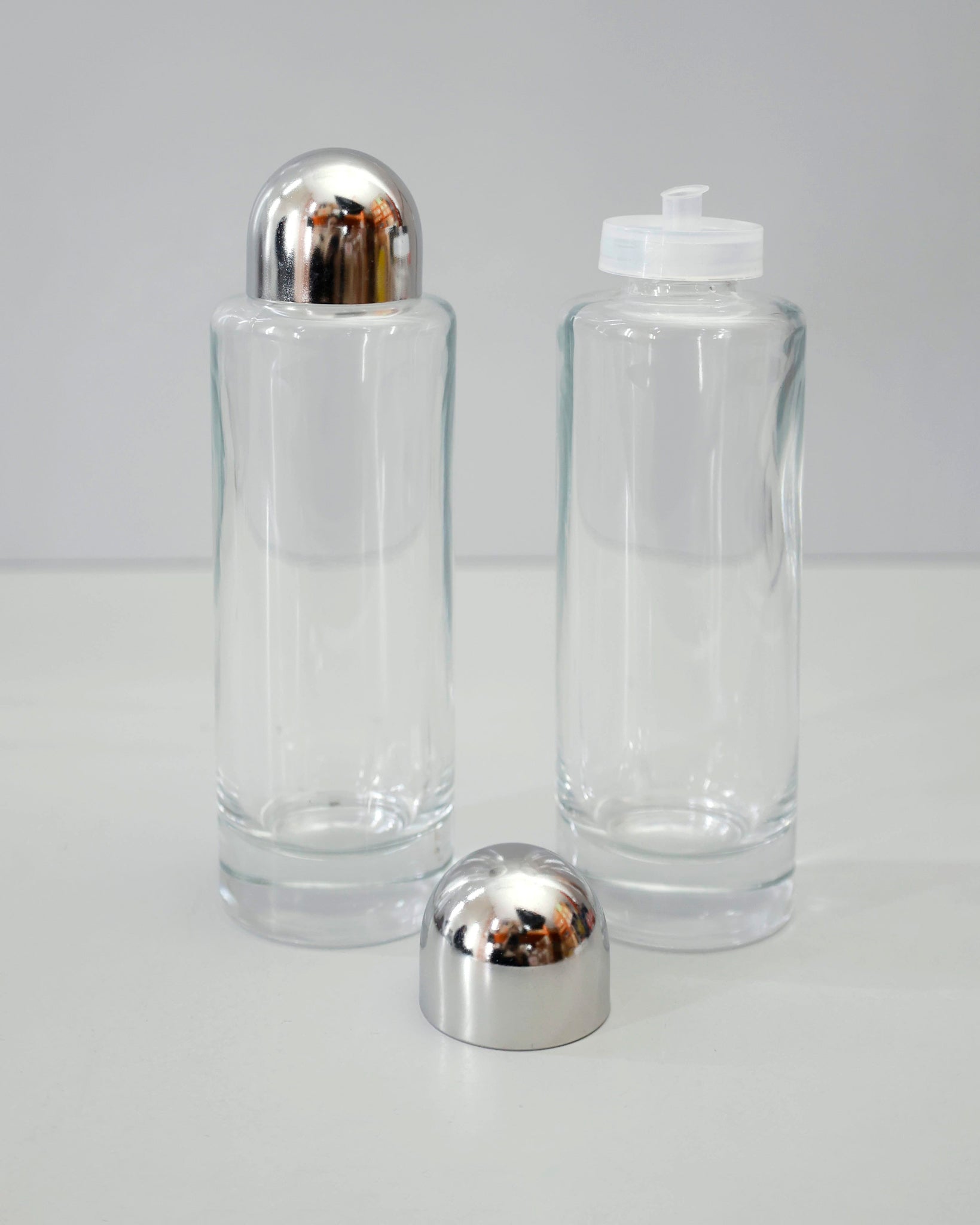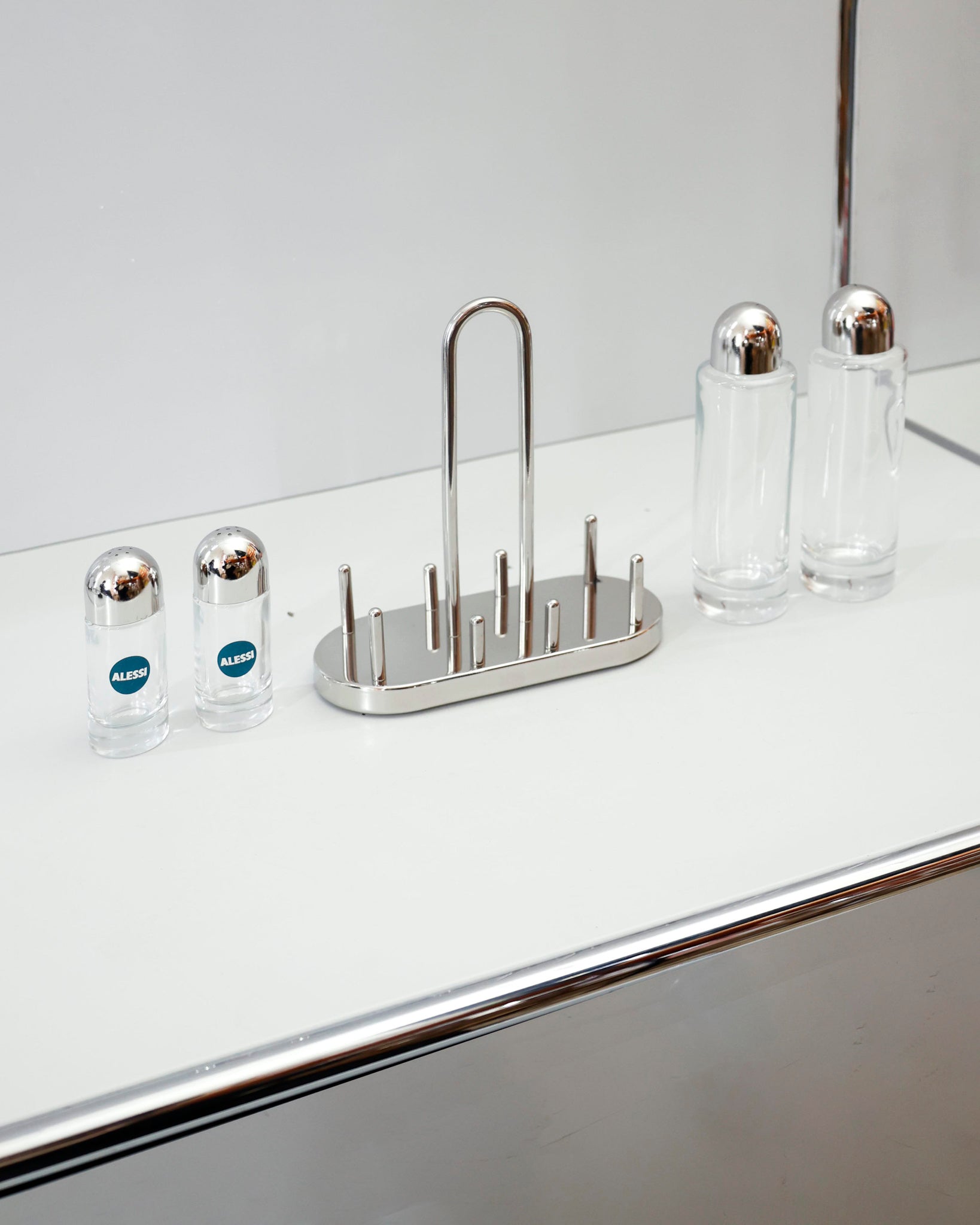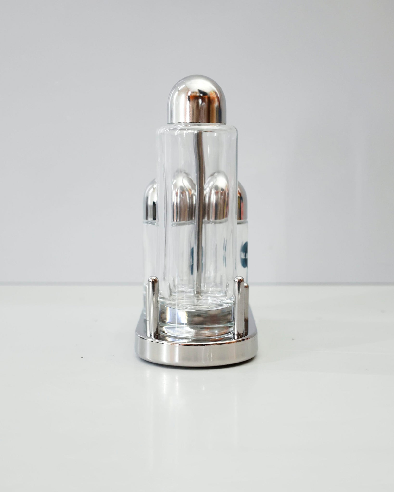 Composed of crystalline glass containers held within a sleek stainless-steel stand, the 5070 Condiment Set offers a functional yet stylish way to serve oil, vinegar, salt, and pepper. With its clean lines and balanced proportions, it reflects Sottsass’s ability to elevate everyday objects into timeless design pieces.