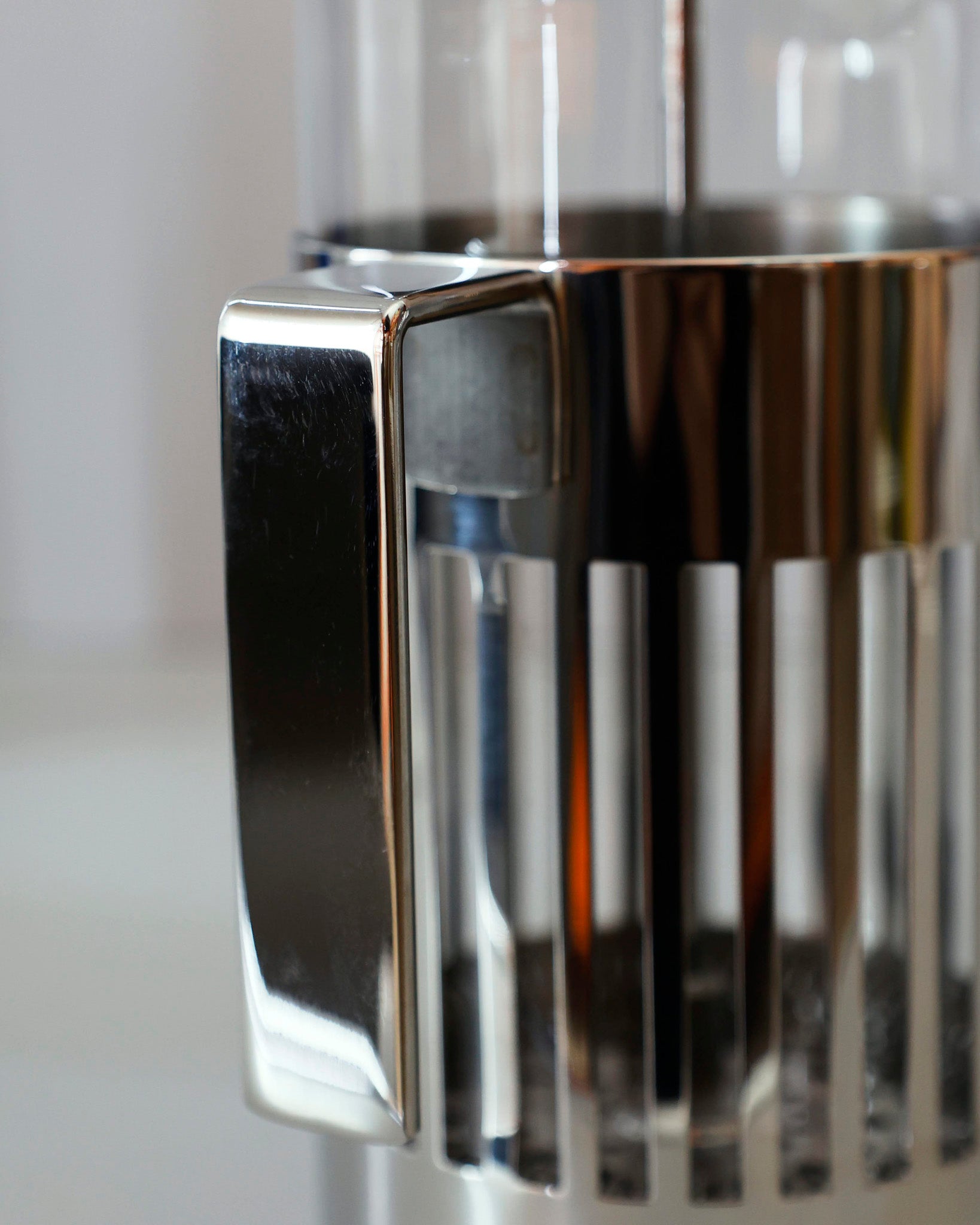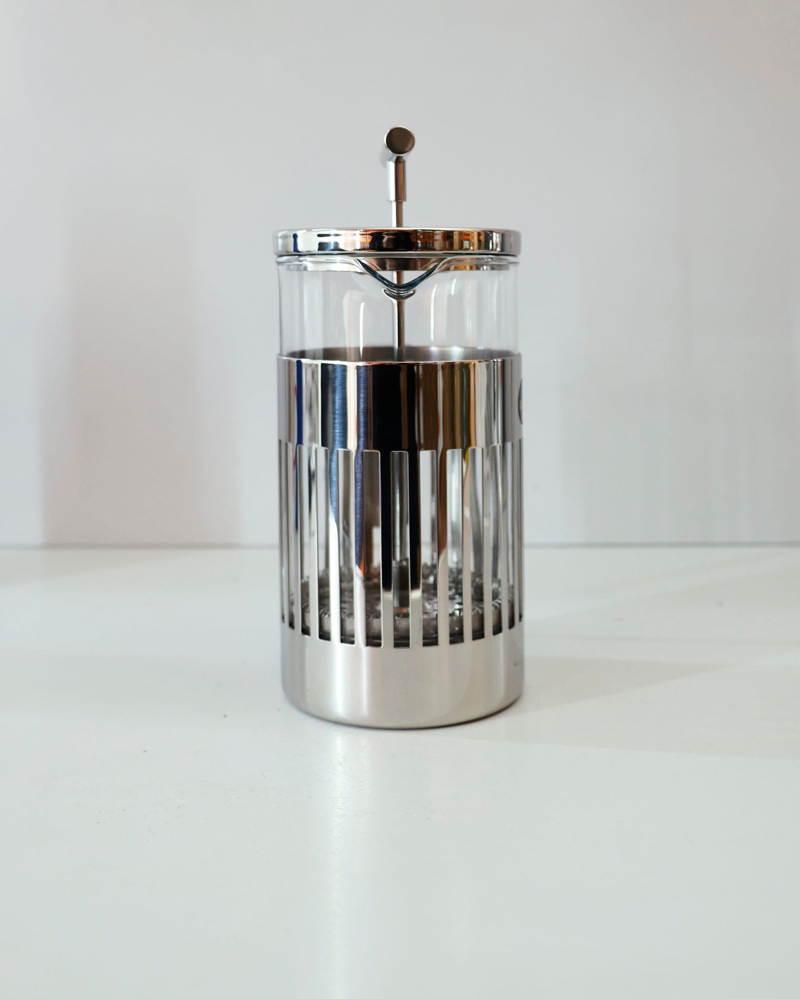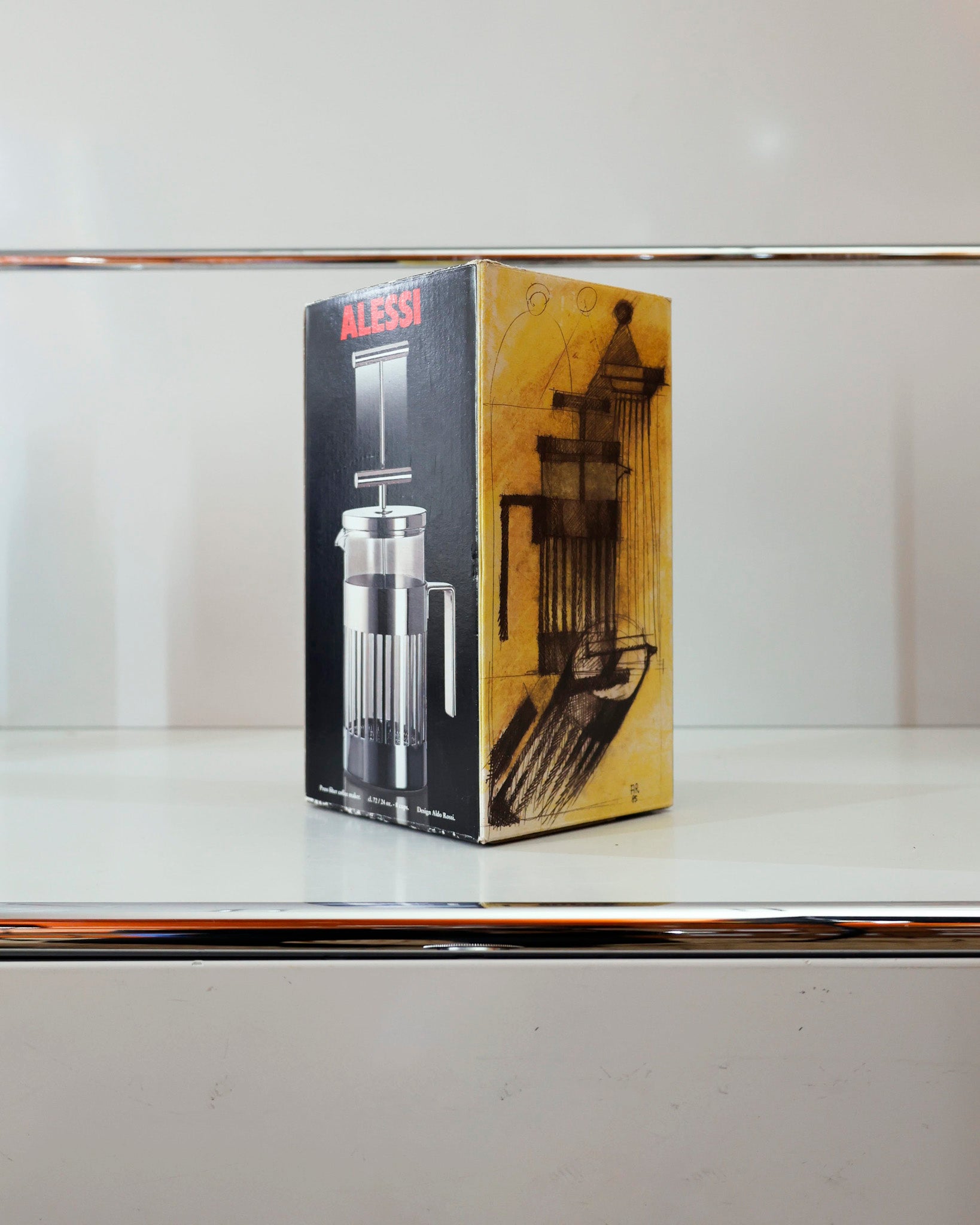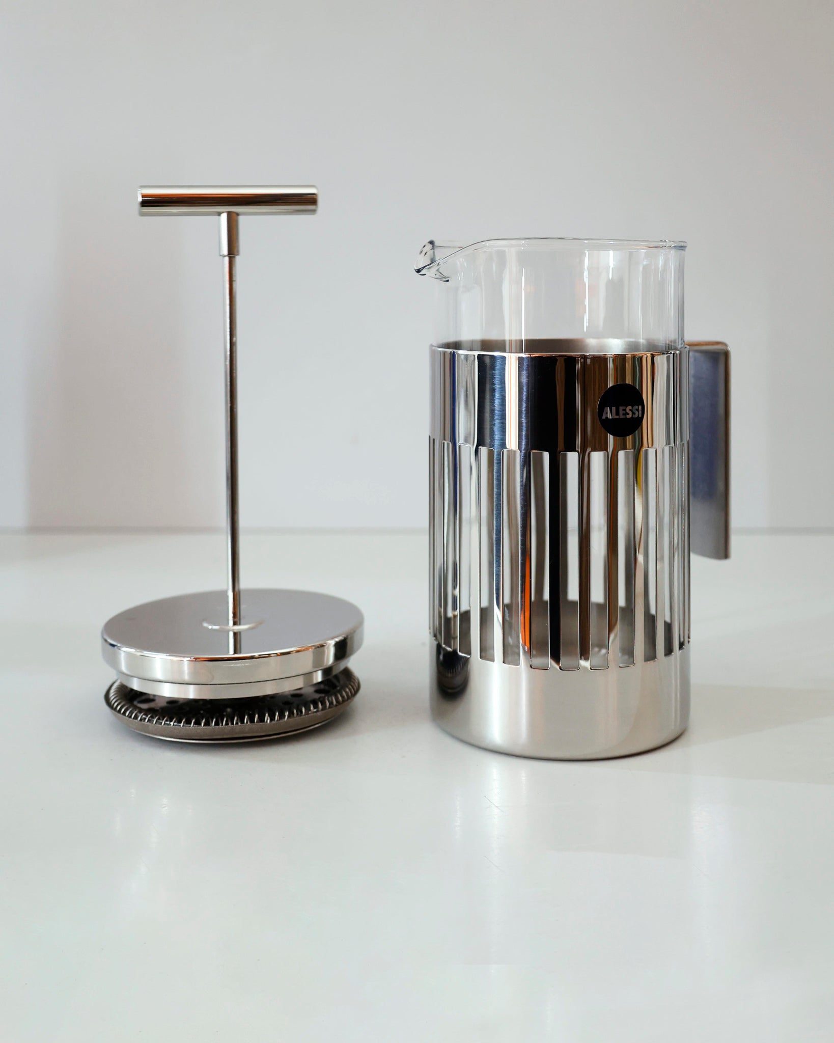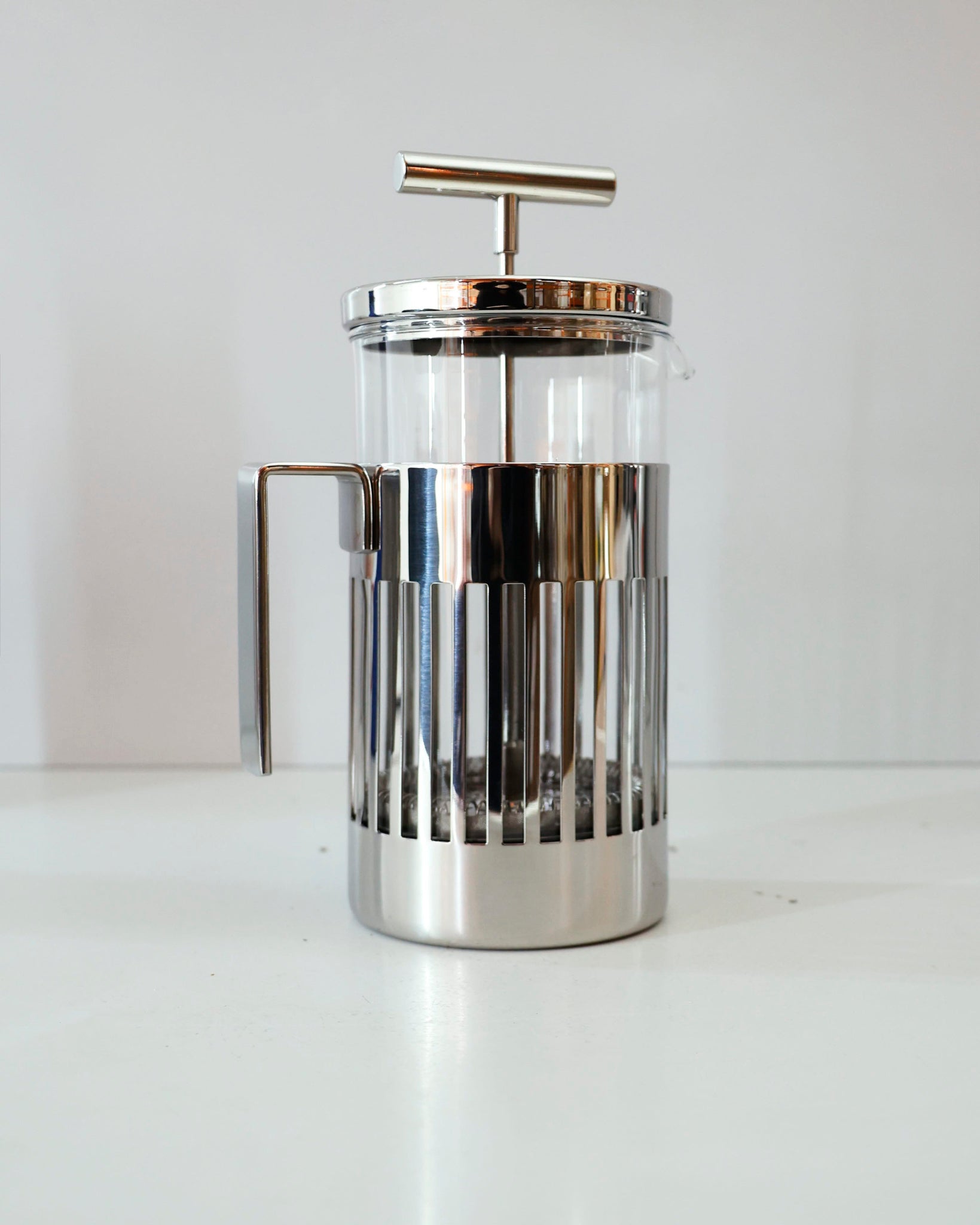 A press-filter coffee maker or French Press style brewer designed by Aldo Rossi. Features Rossi’s minimalist approach with clean geometry and a strong presence of form. A refined piece that sits well in both modern and classic kitchen settings.
