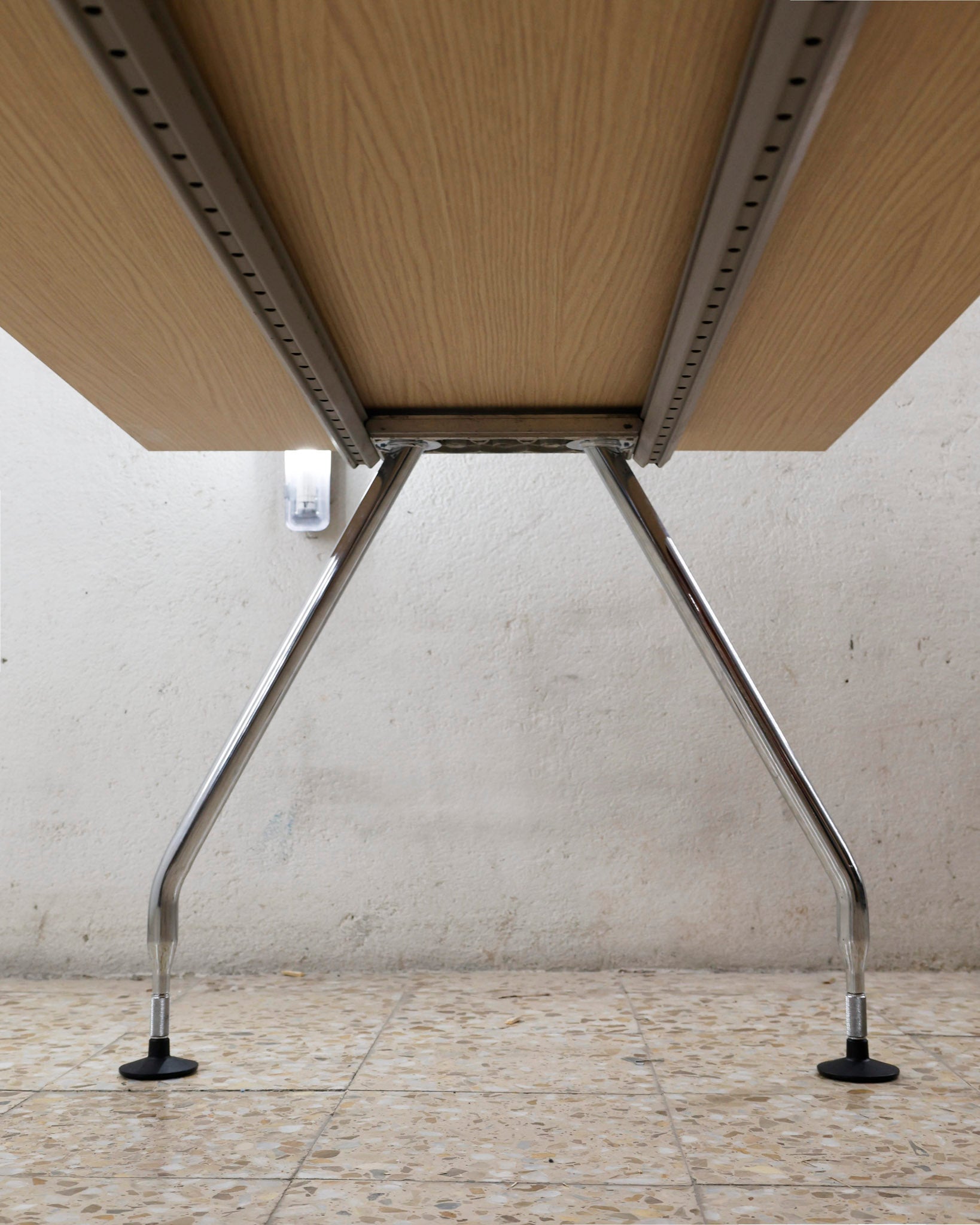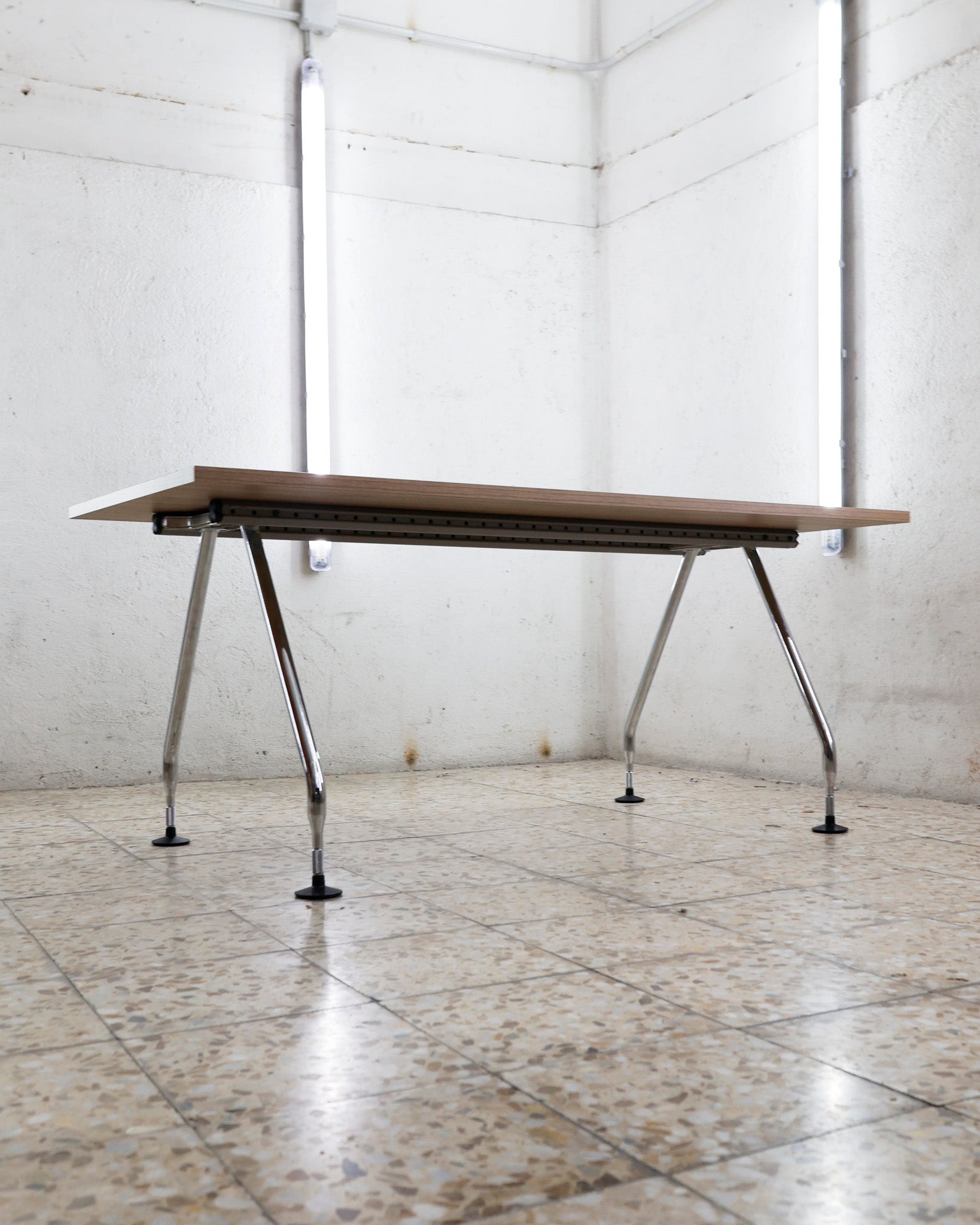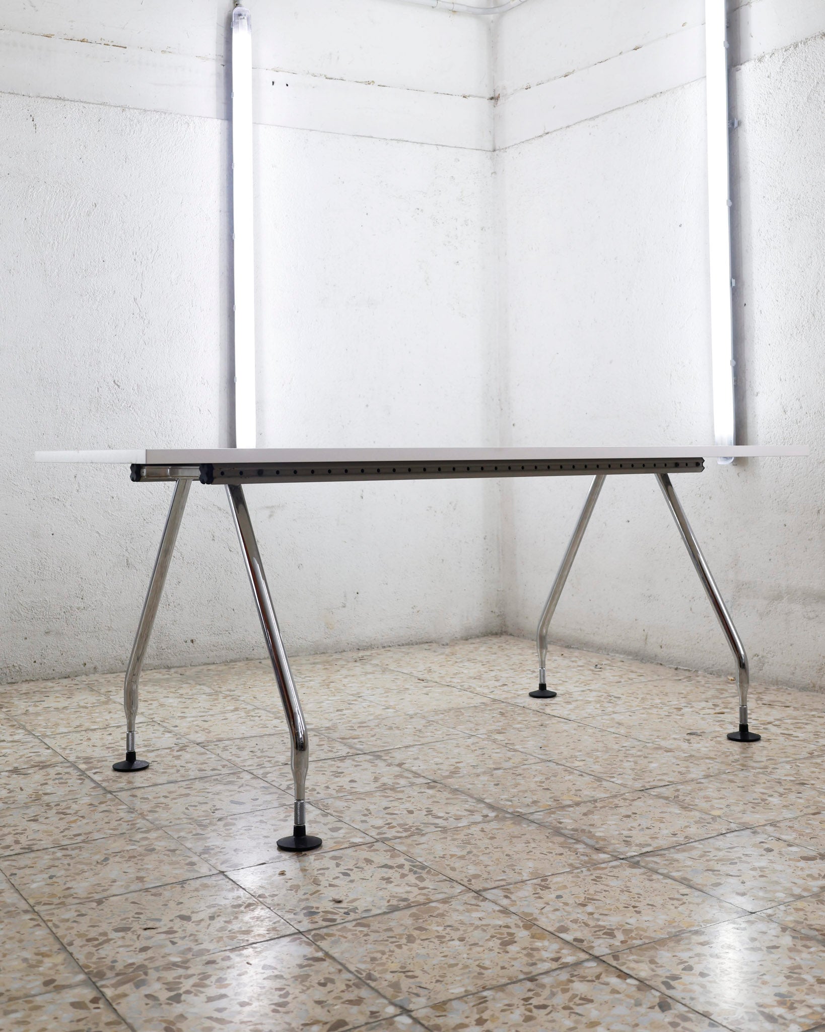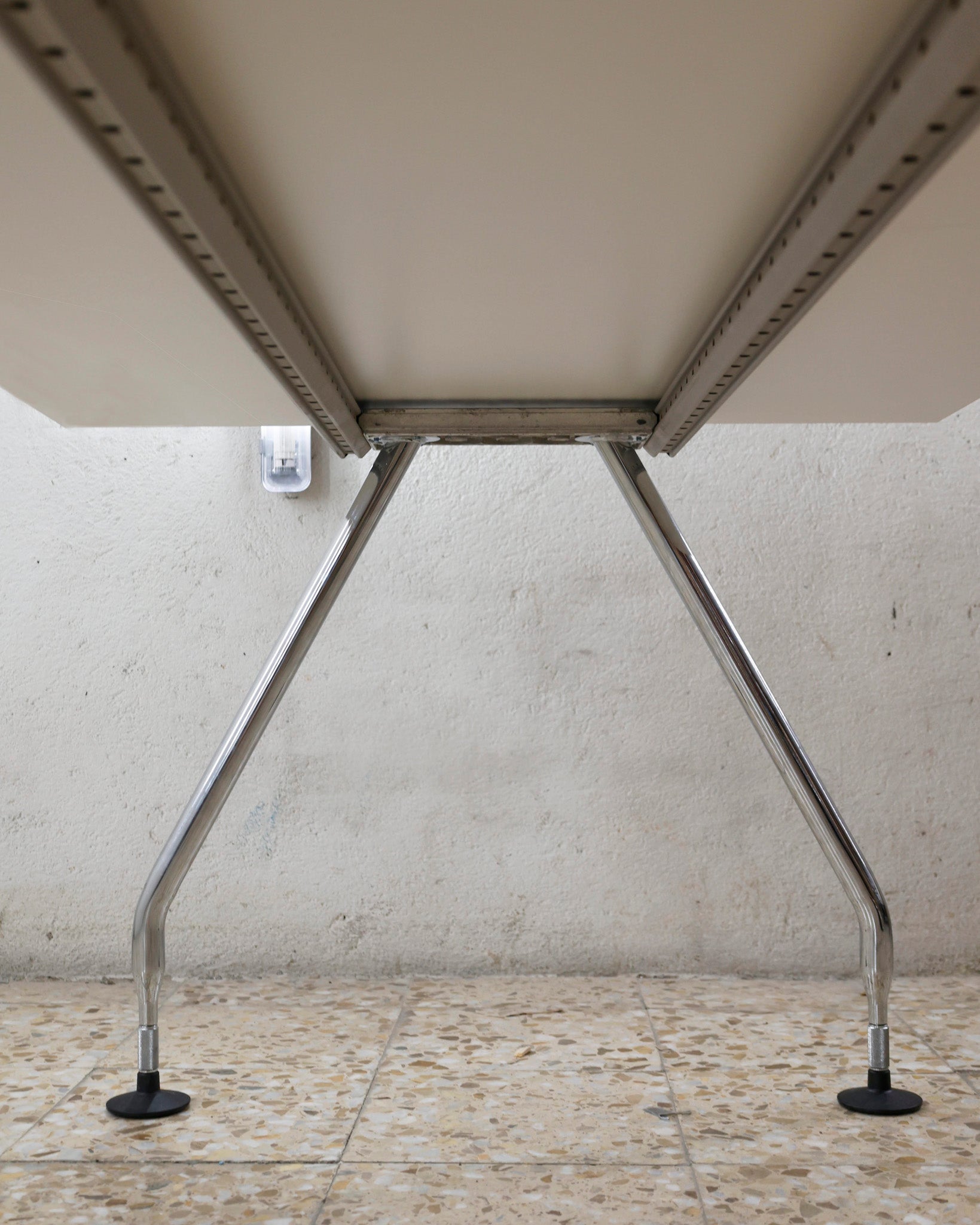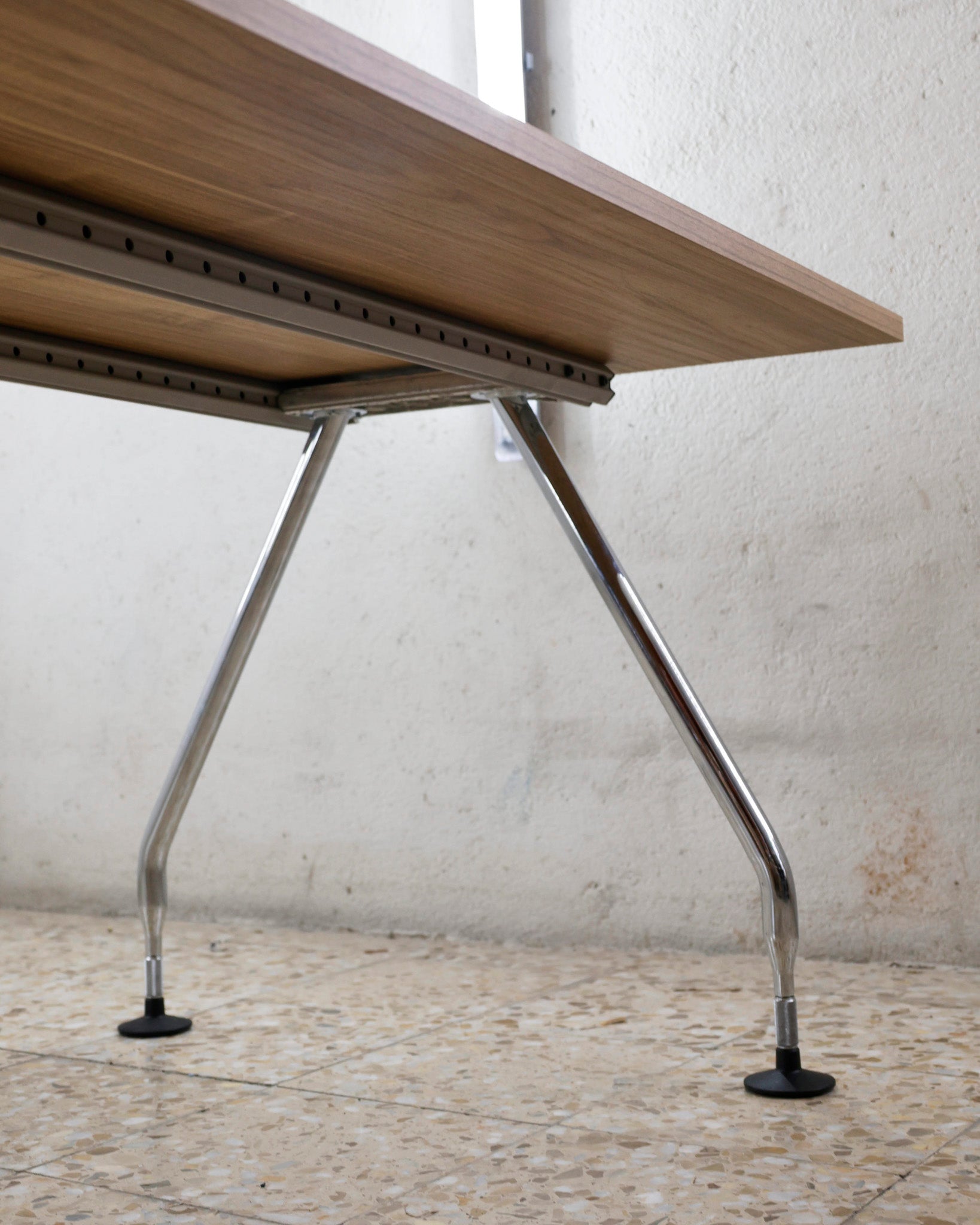 This desk belongs to the Ad Hoc office furniture family designed by Antonio Citterio for Vitra in 1994. A substructure of splicable square beams and aluminium cast triangular legs can be assembled in any intermediate position to configure unlimited, made-to-measure desks. Its name speaks for its flexibility.