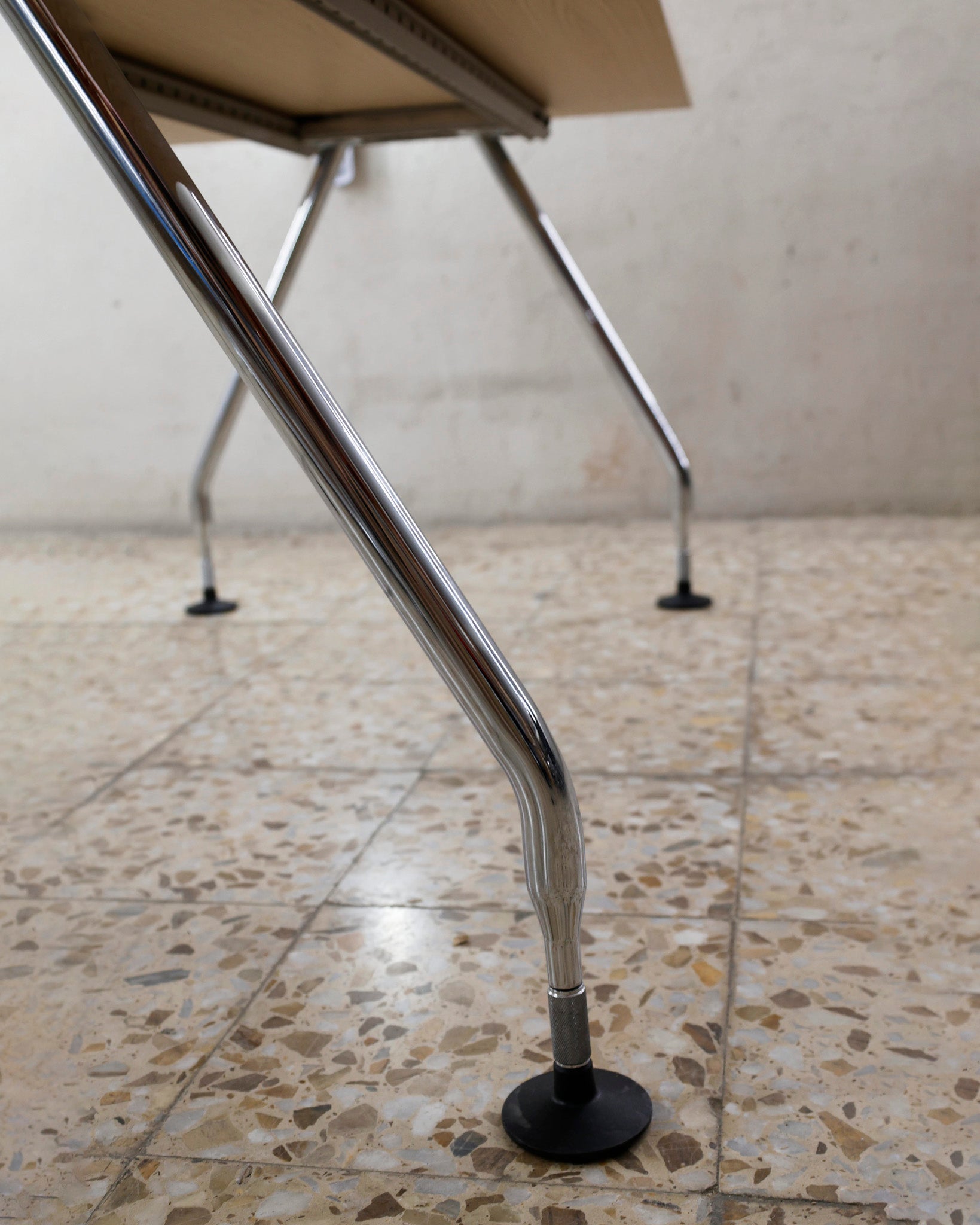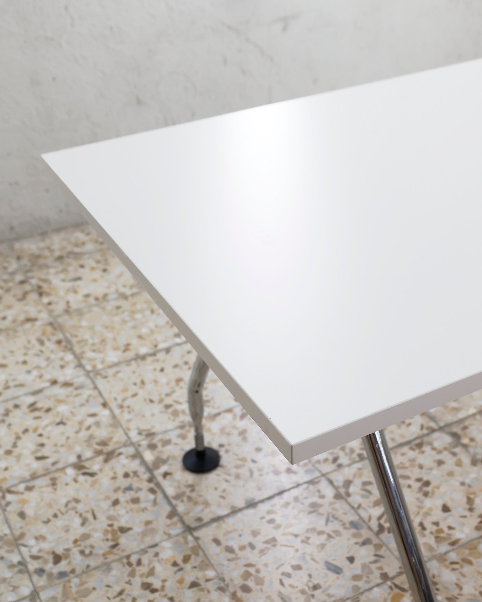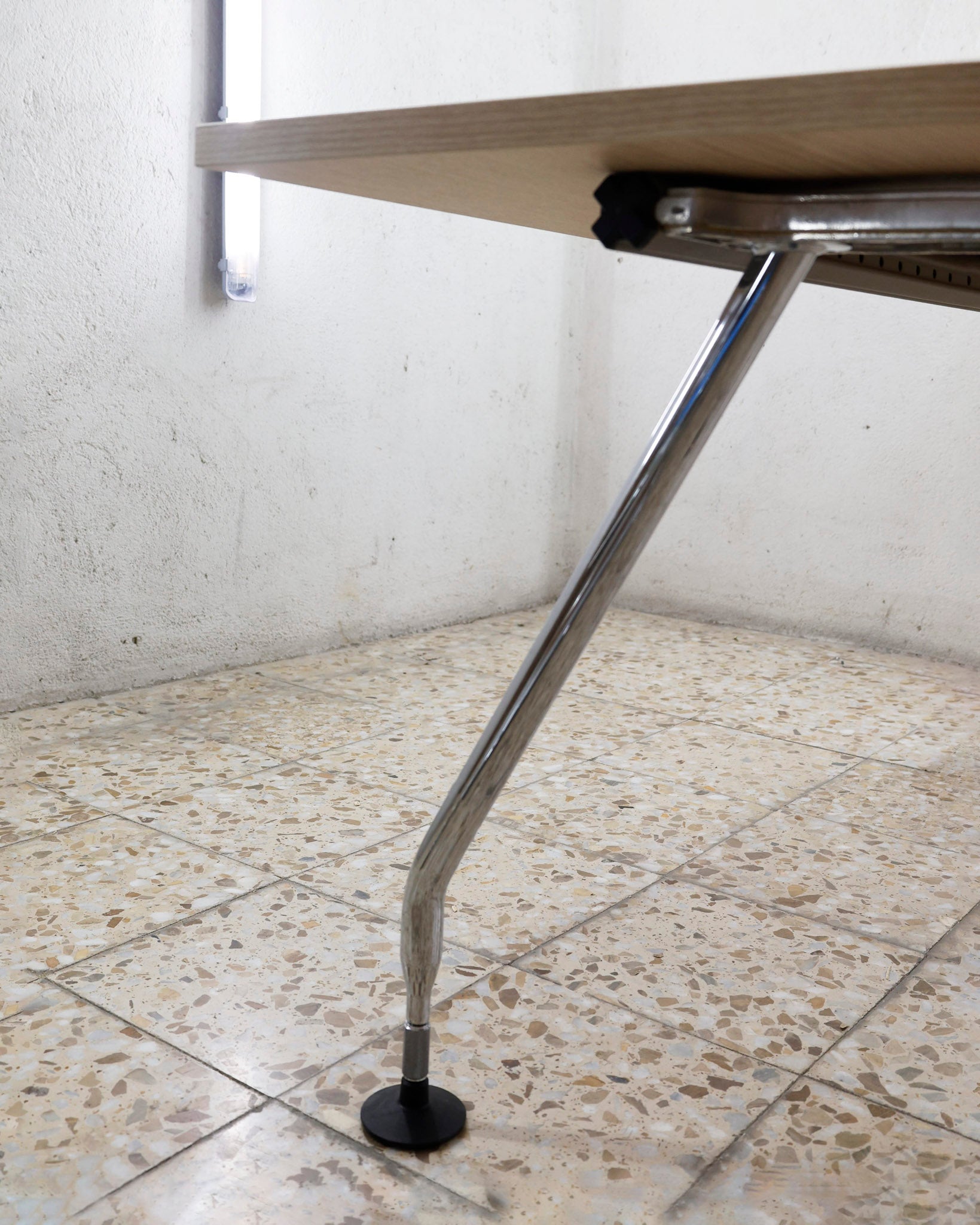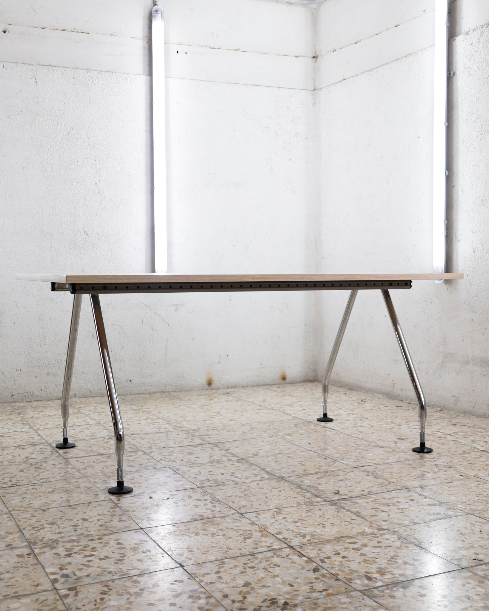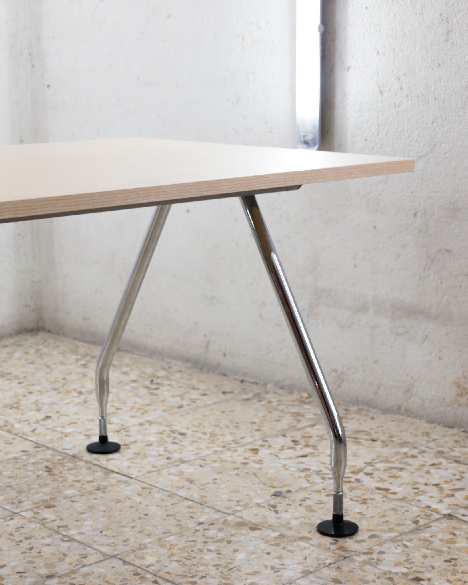 This desk belongs to the Ad Hoc office furniture family designed by Antonio Citterio for Vitra in 1994. A substructure of splicable square beams and aluminium cast triangular legs can be assembled in any intermediate position to configure unlimited, made-to-measure desks. Its name speaks for its flexibility.