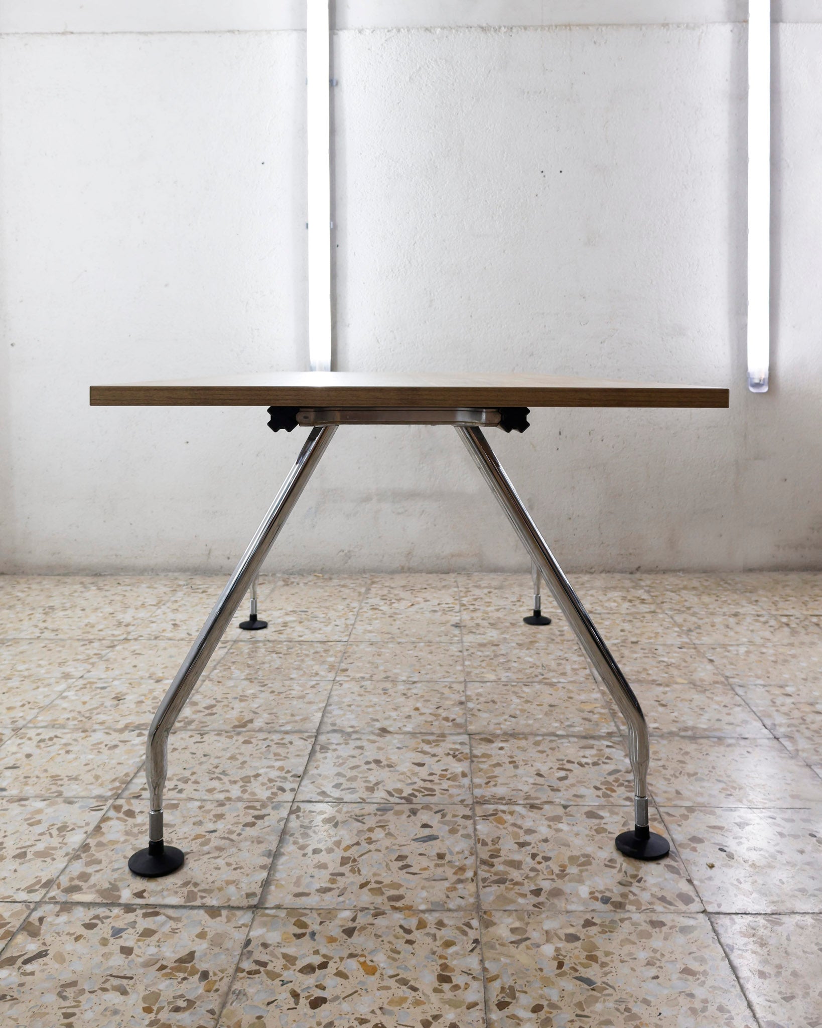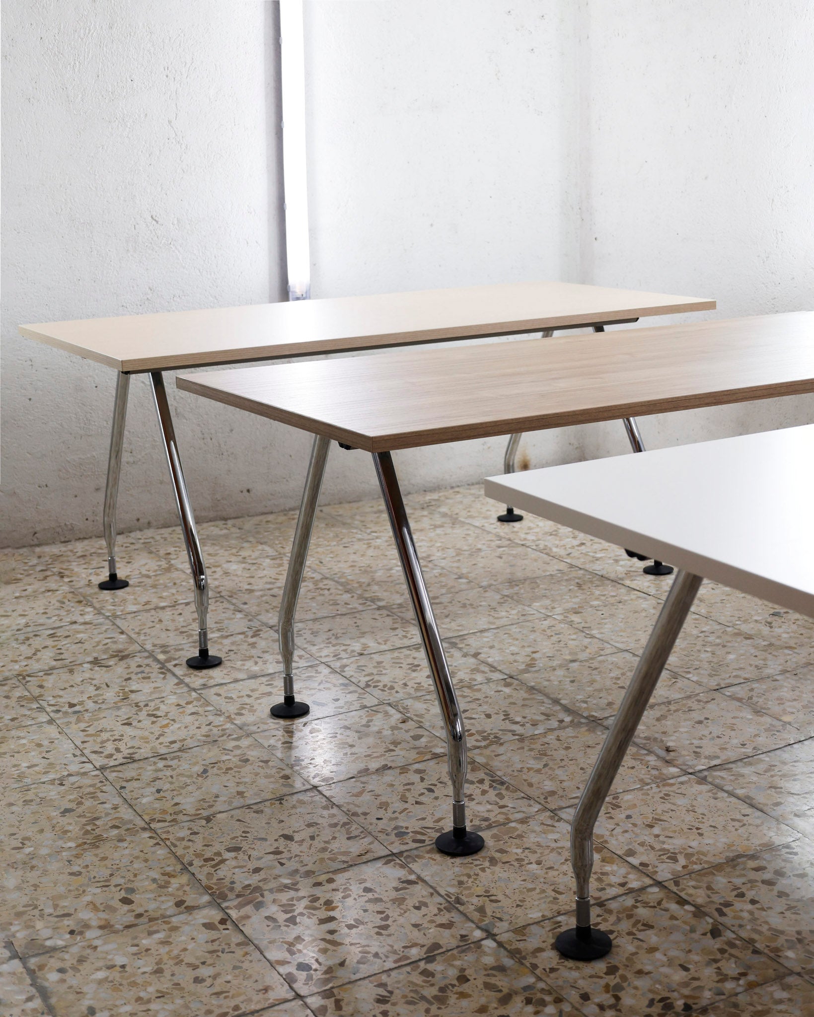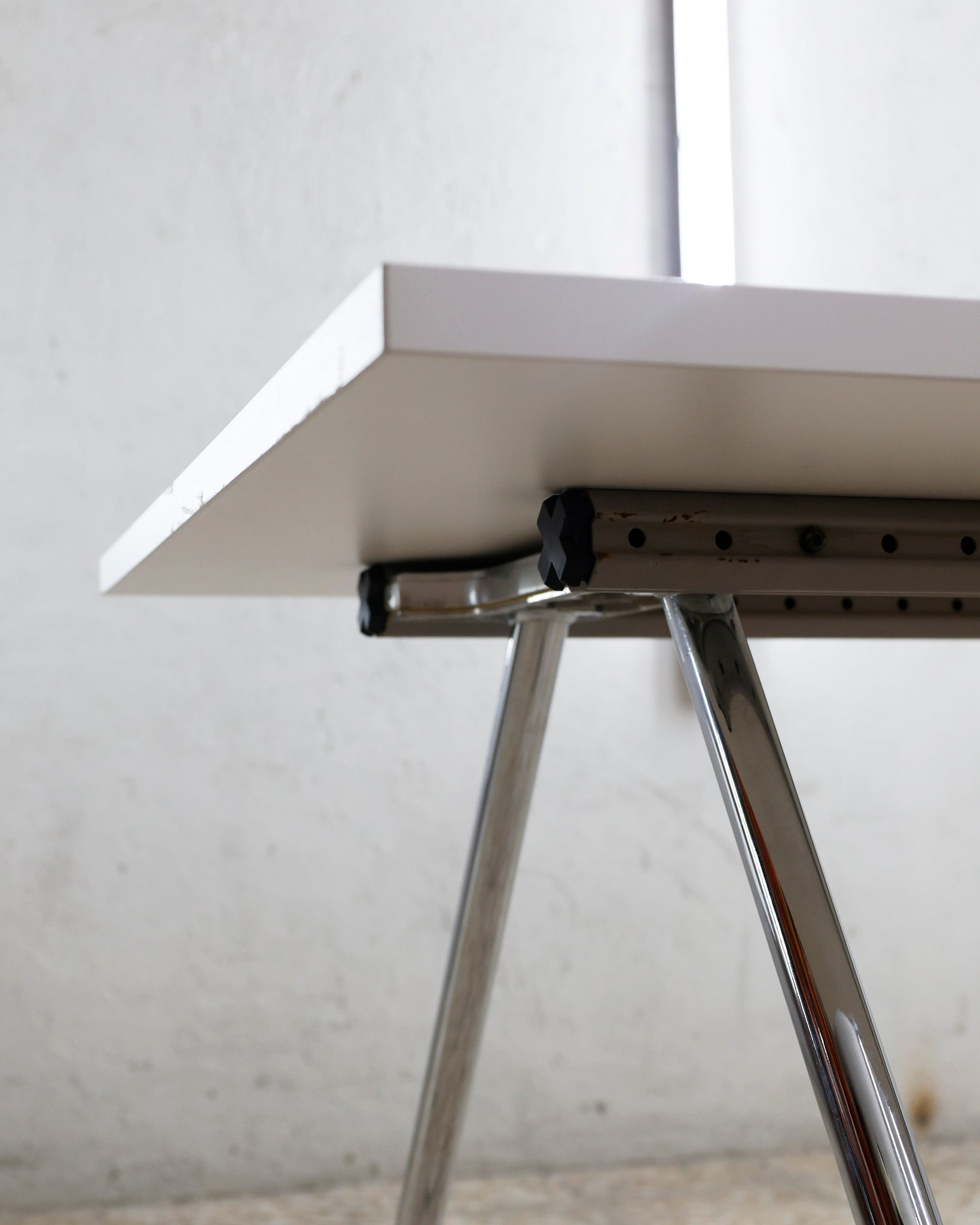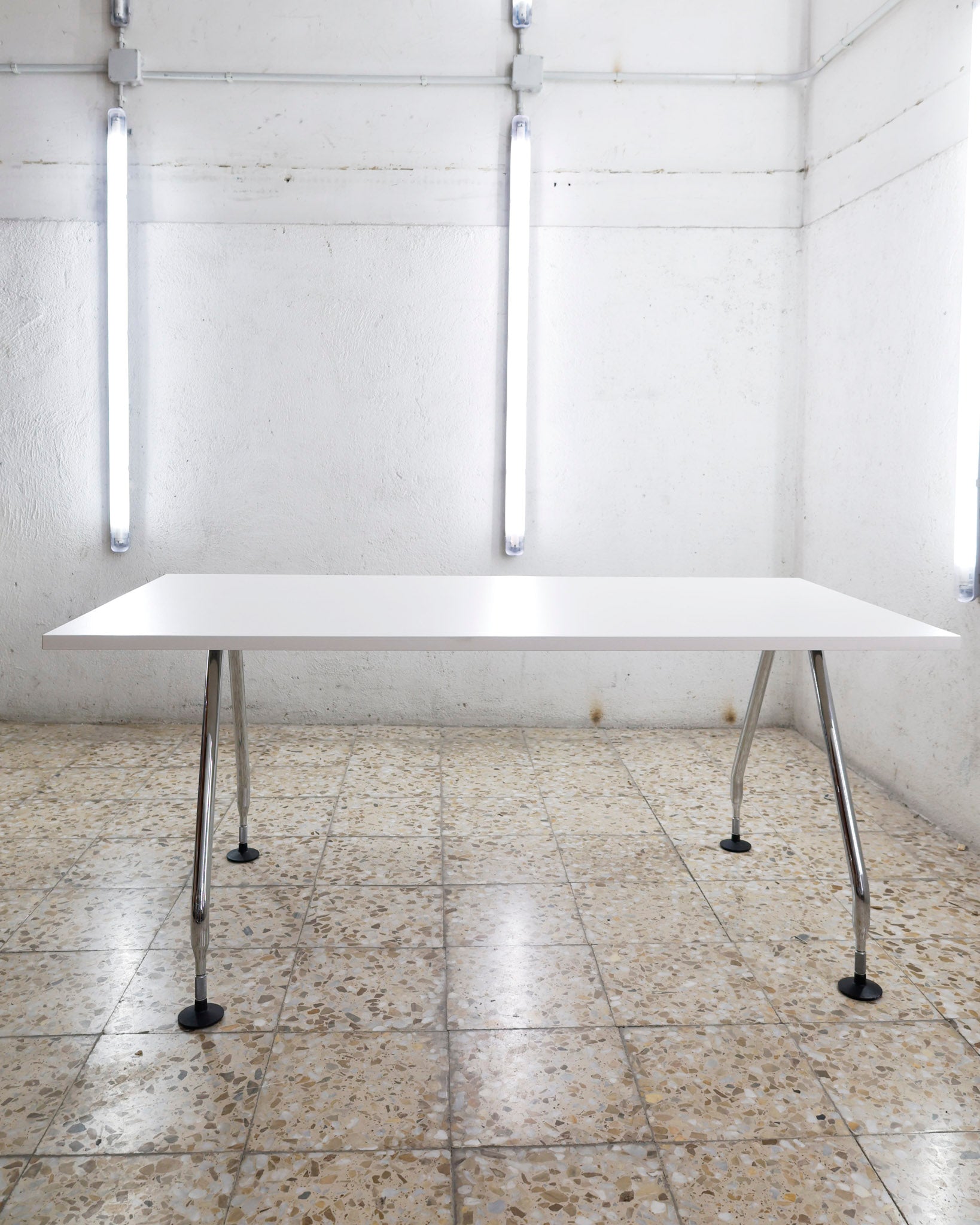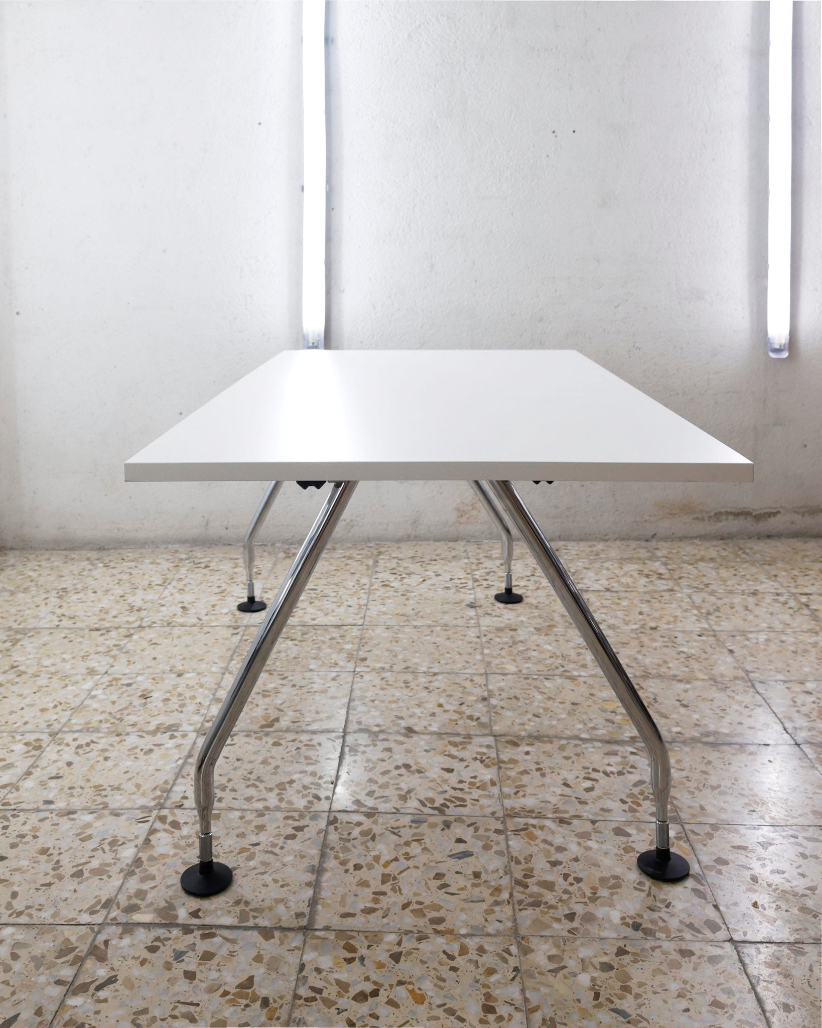 This desk belongs to the Ad Hoc office furniture family designed by Antonio Citterio for Vitra in 1994. A substructure of splicable square beams and aluminium cast triangular legs can be assembled in any intermediate position to configure unlimited, made-to-measure desks. Its name speaks for its flexibility.