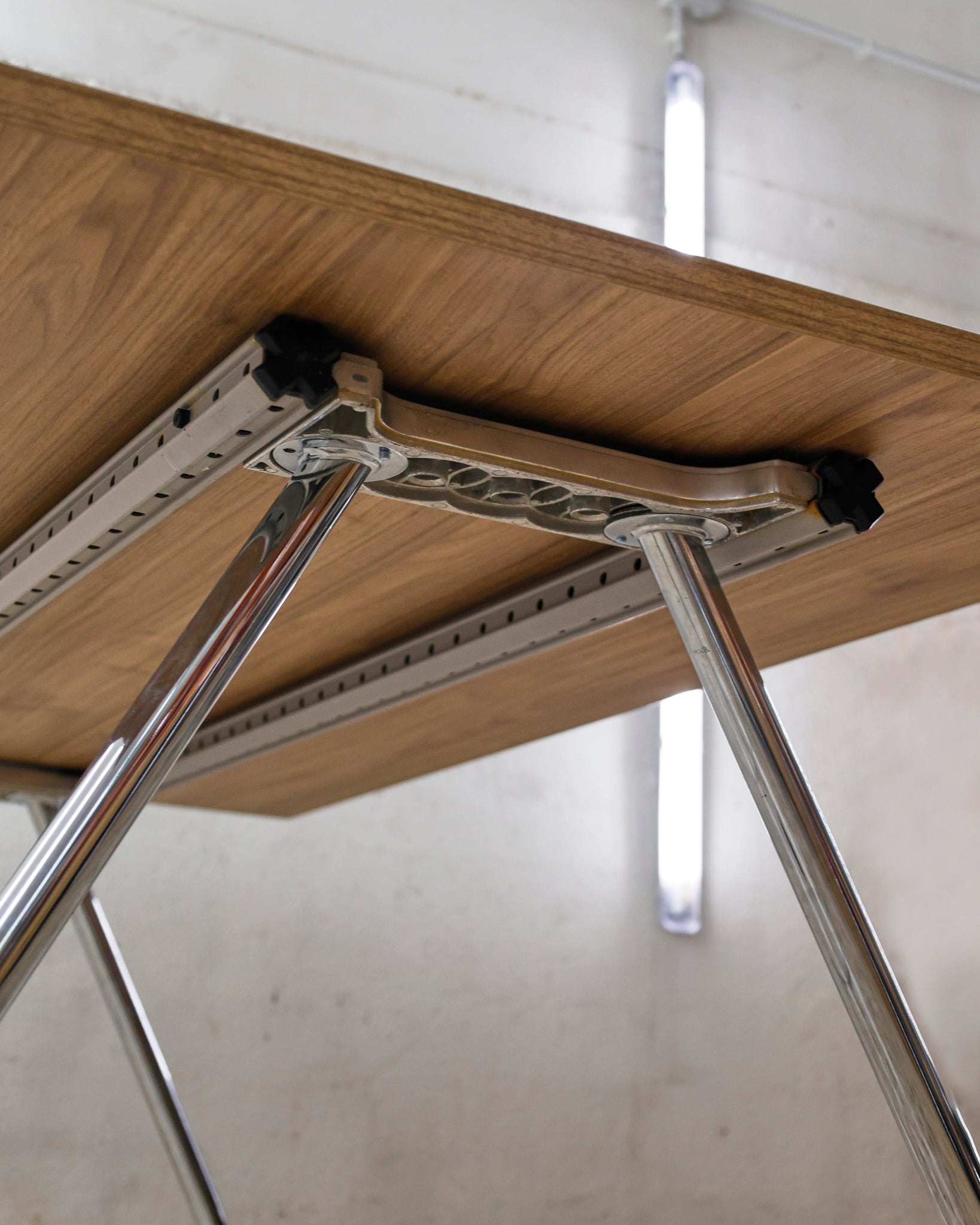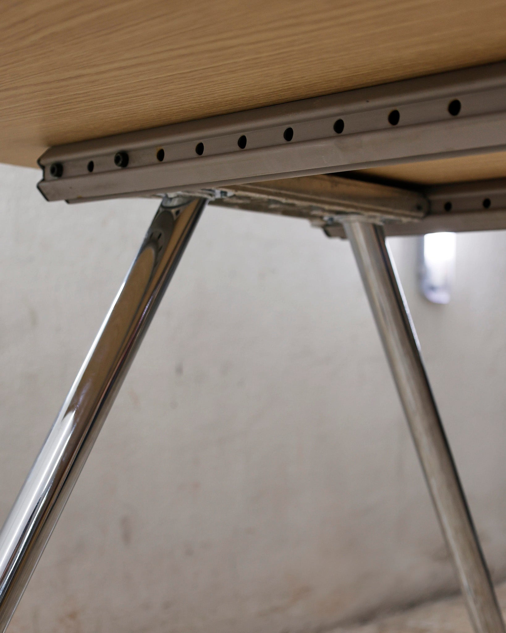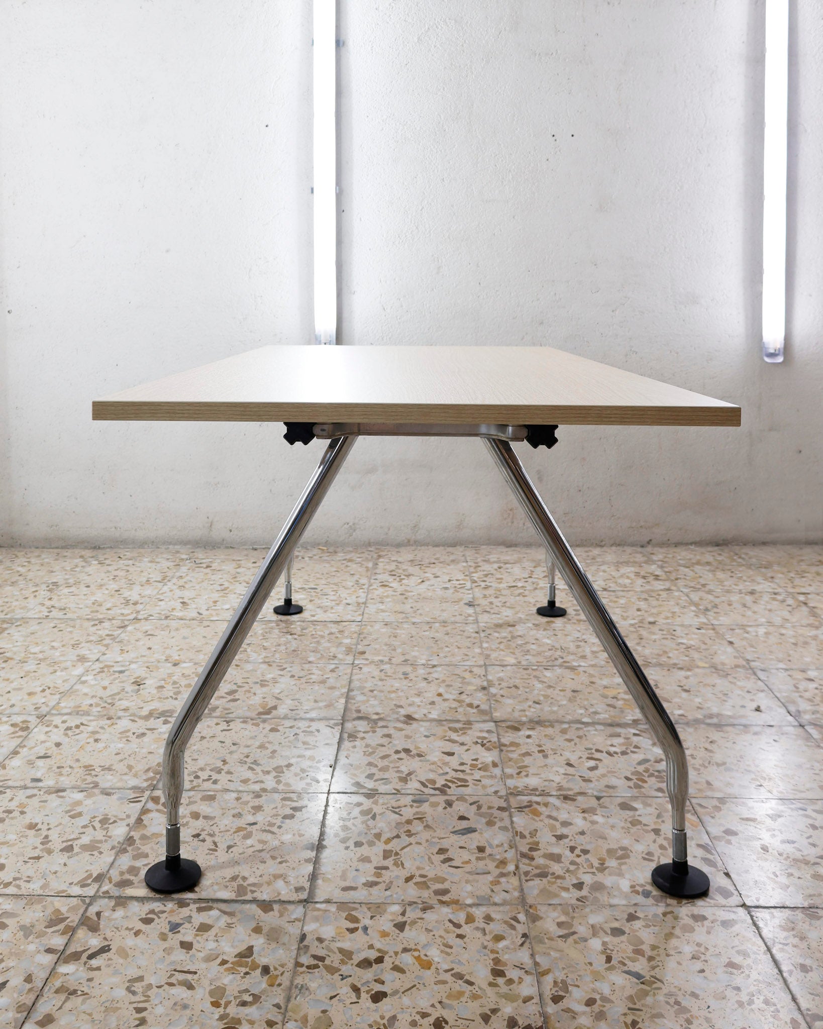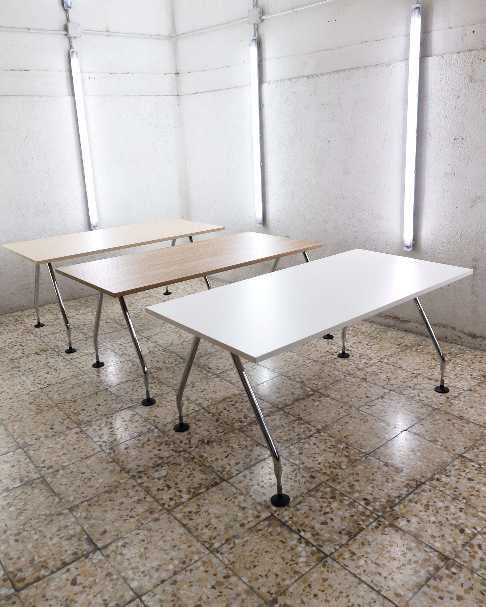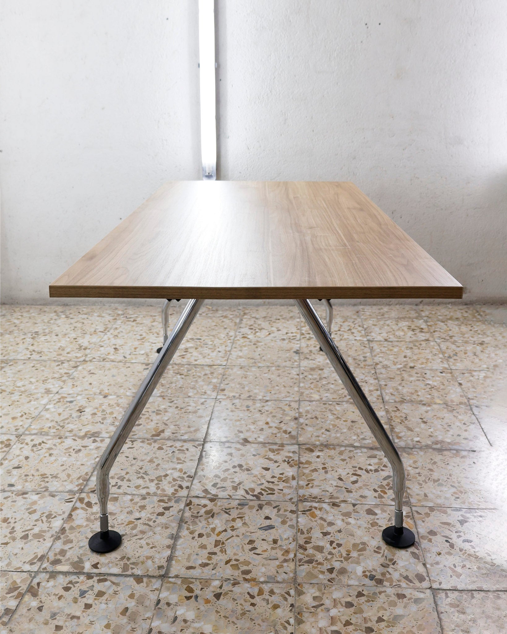 This desk belongs to the Ad Hoc office furniture family designed by Antonio Citterio for Vitra in 1994. A substructure of splicable square beams and aluminium cast triangular legs can be assembled in any intermediate position to configure unlimited, made-to-measure desks. Its name speaks for its flexibility.