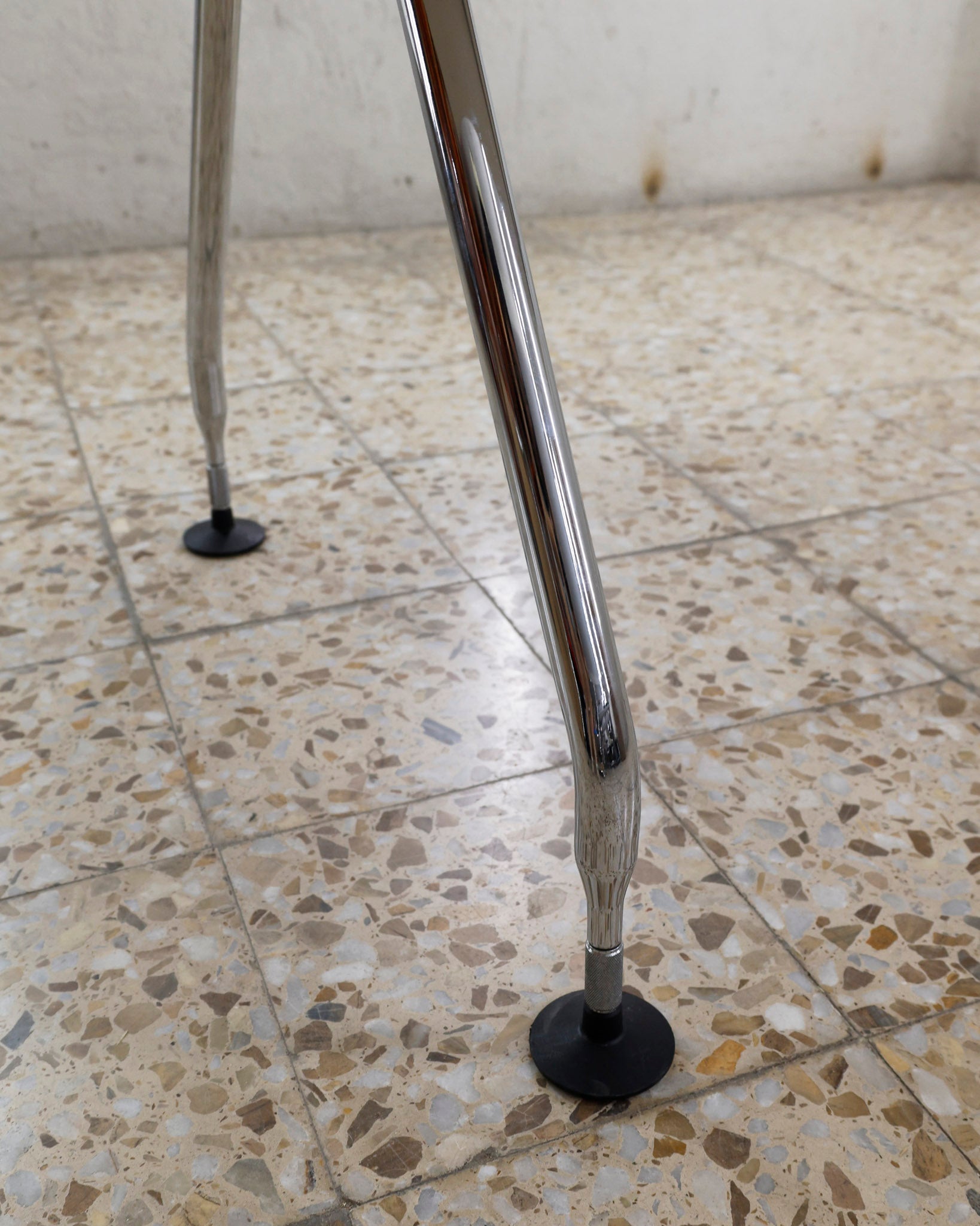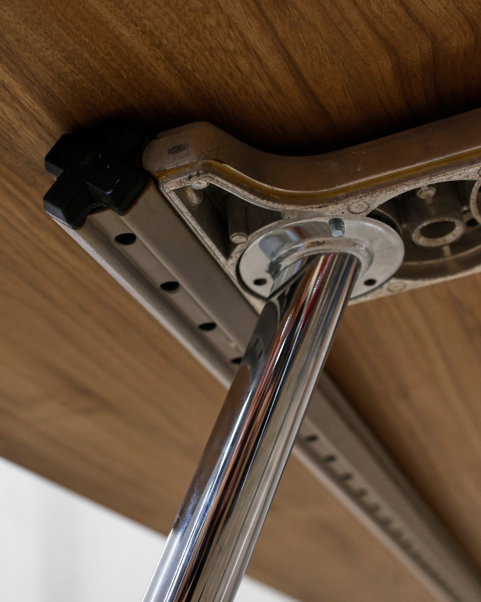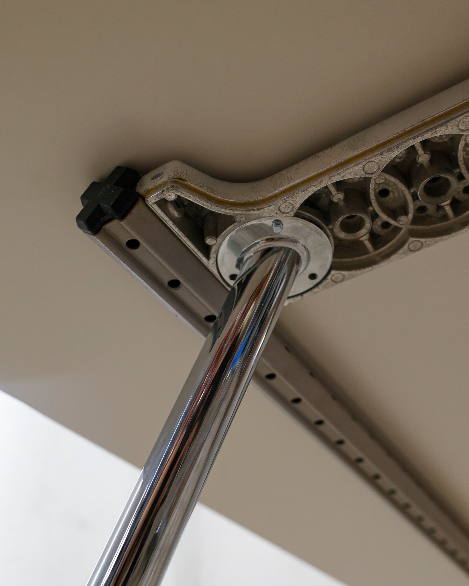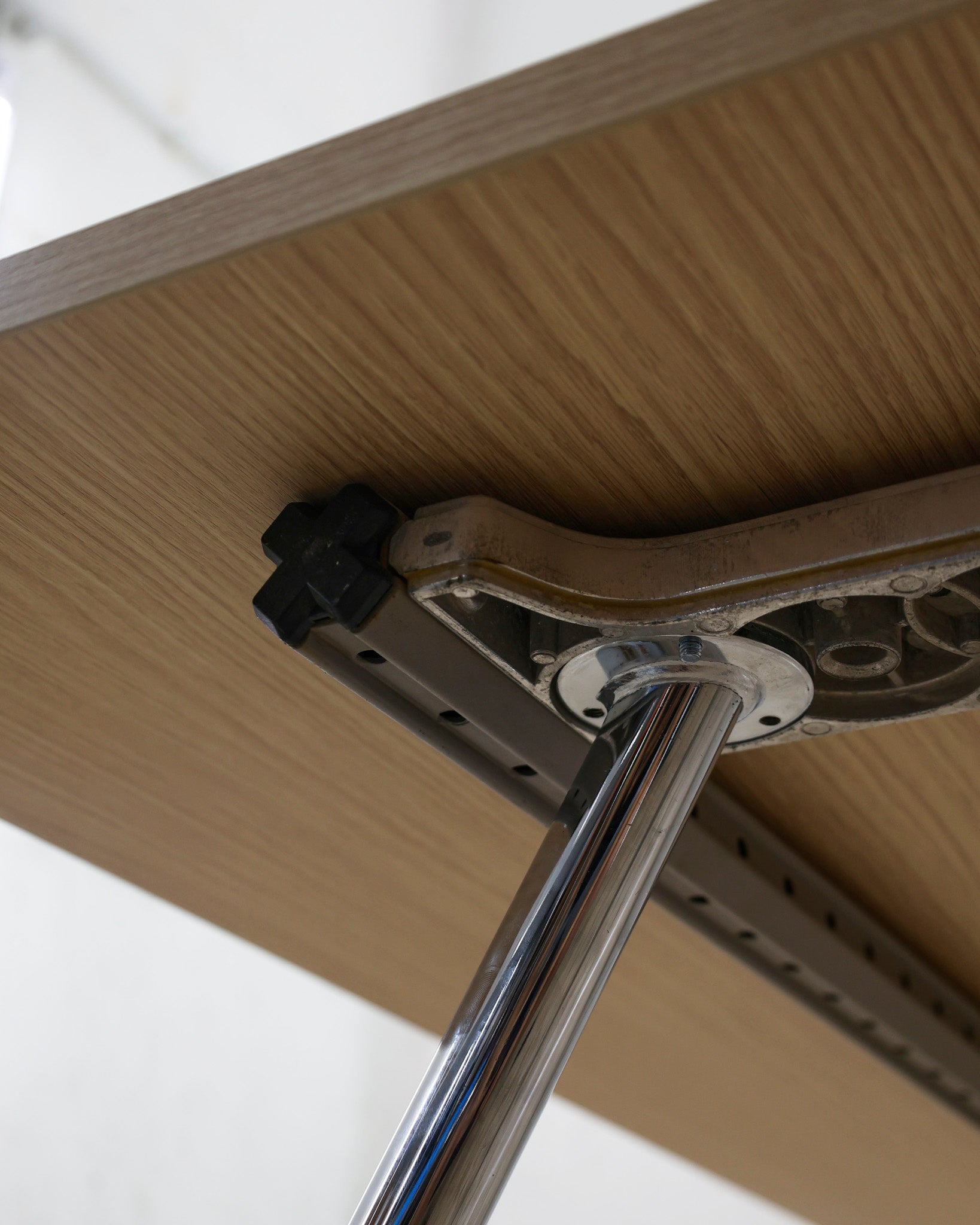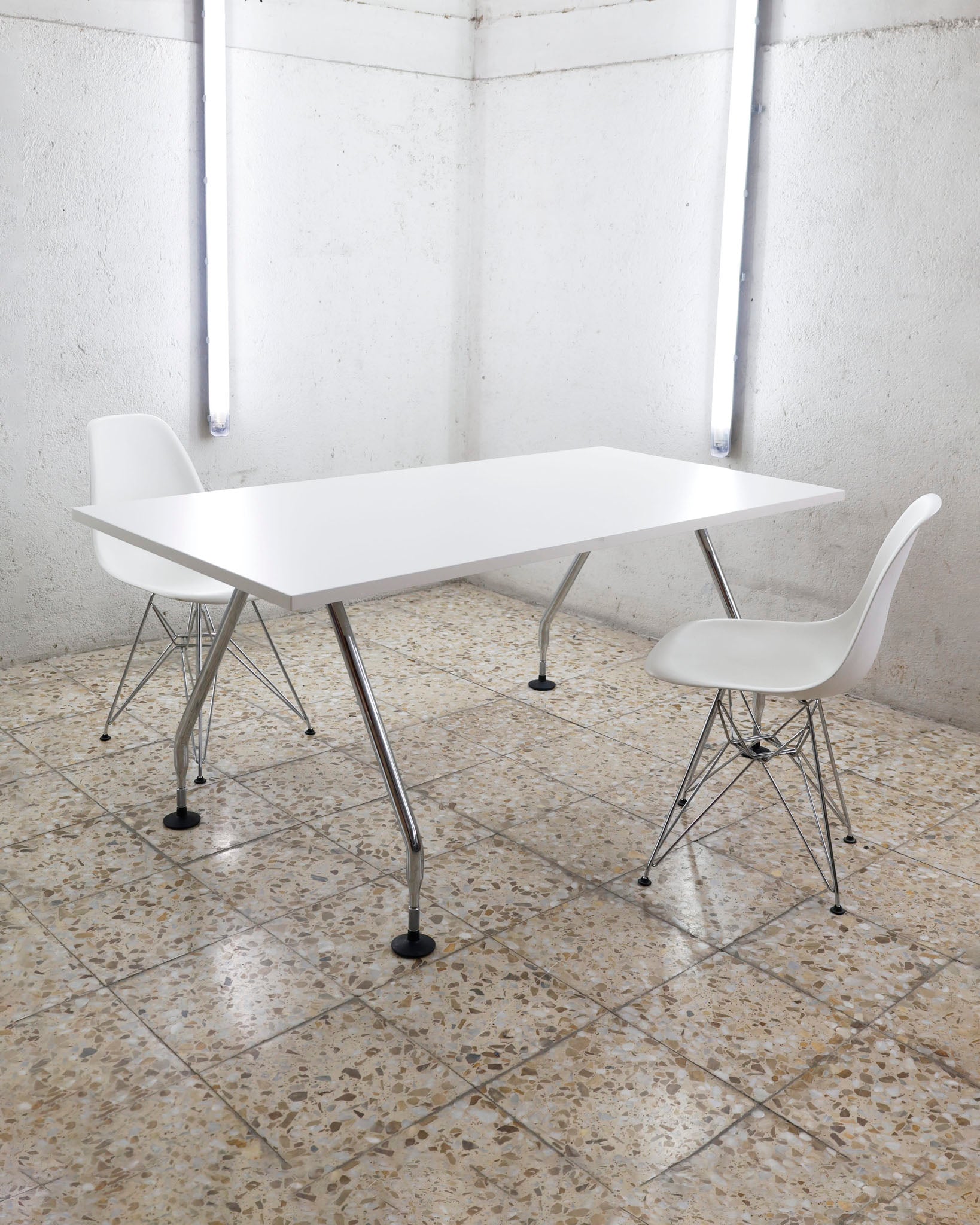 This desk belongs to the Ad Hoc office furniture family designed by Antonio Citterio for Vitra in 1994. A substructure of splicable square beams and aluminium cast triangular legs can be assembled in any intermediate position to configure unlimited, made-to-measure desks. Its name speaks for its flexibility.