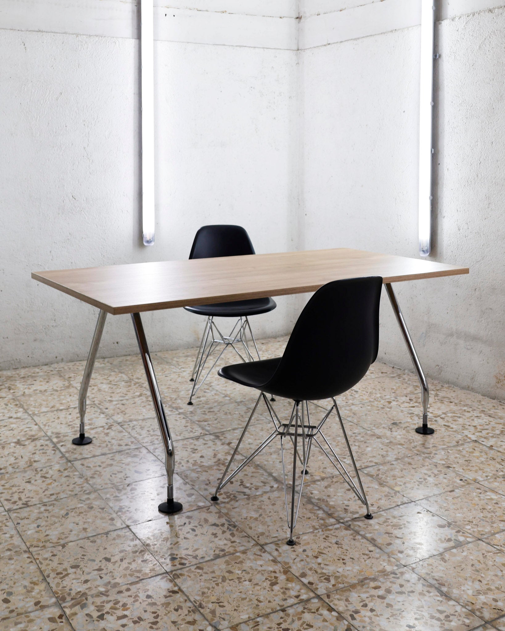 | Materials | Aluminium cast triangular legs, veneer table top |