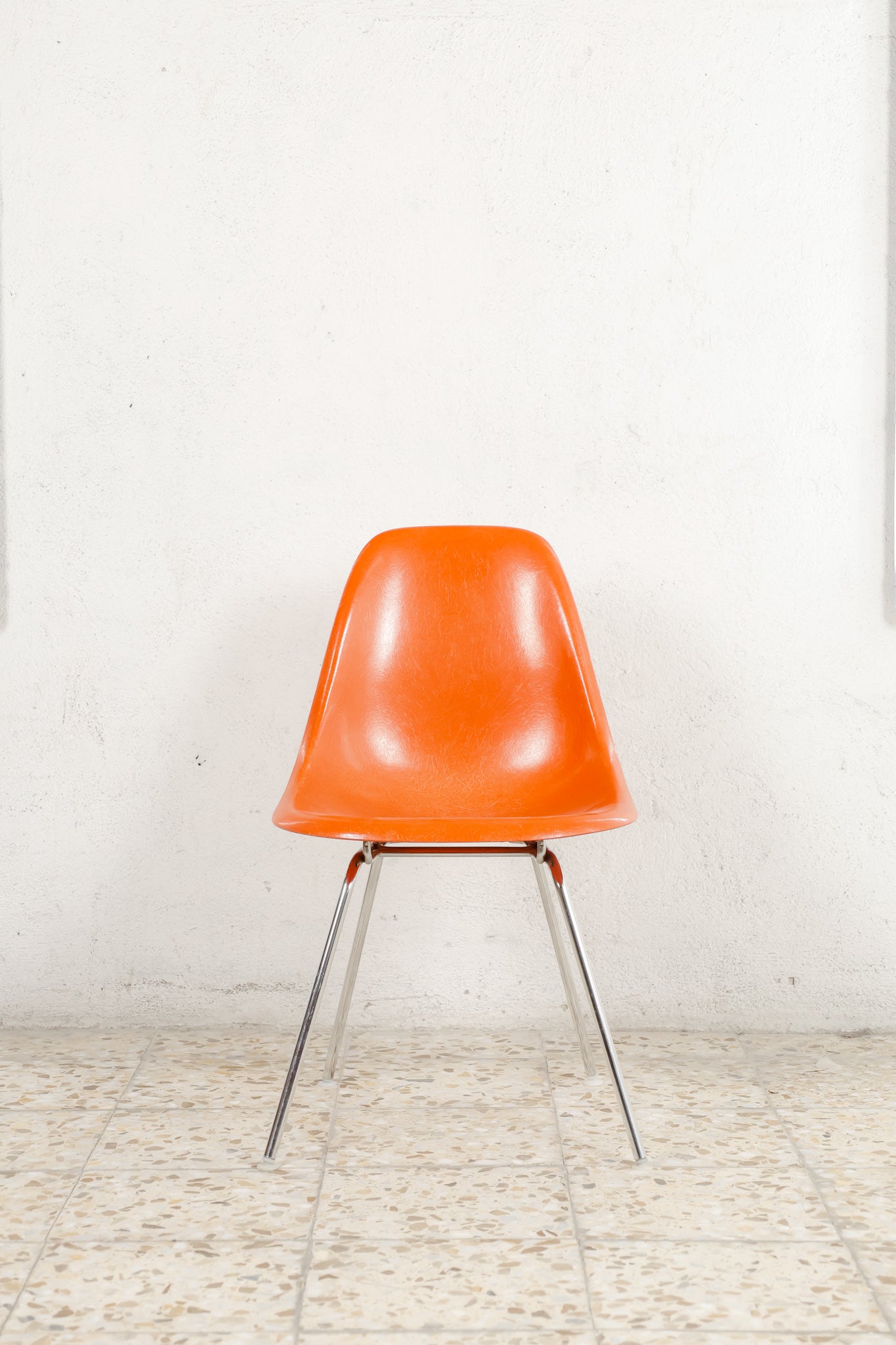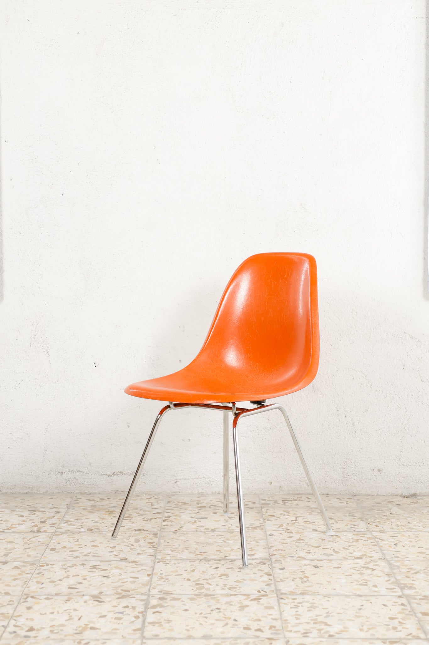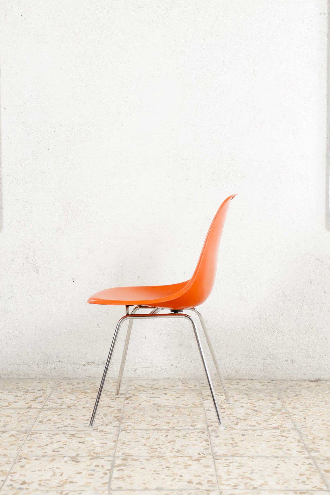 The Herman Miller DSX chairs are crafted in molded fiberglass and available in a orange finish, offering a timeless blend of texture, durability, and classic mid-century style. 4-legged chromed base.