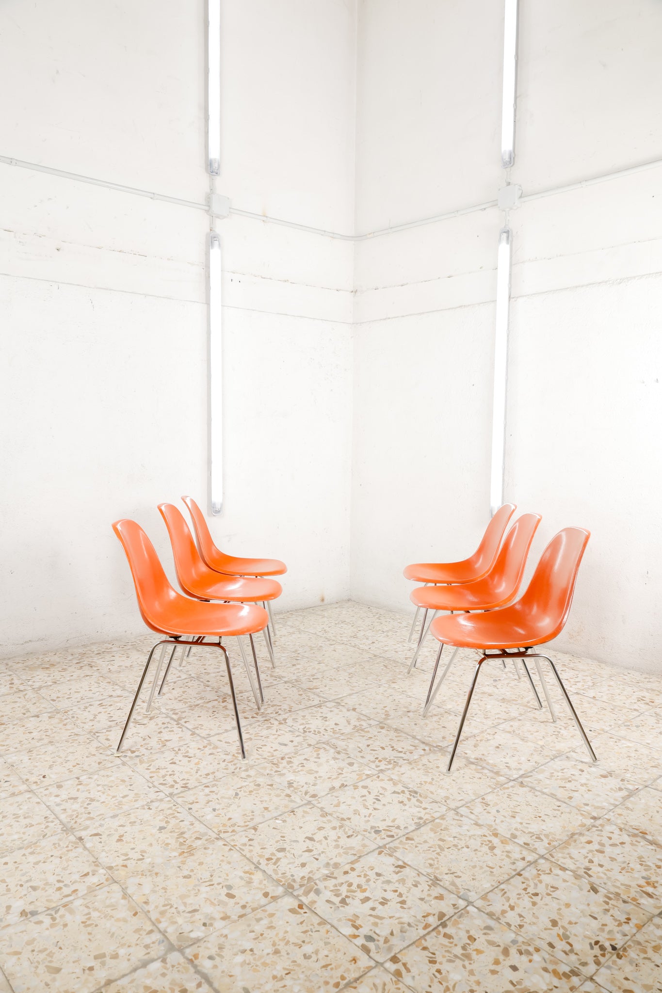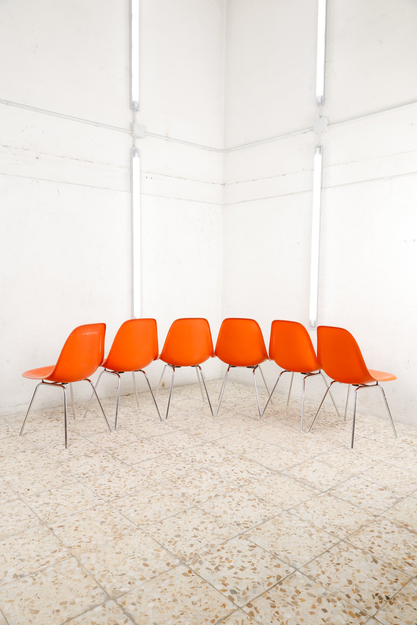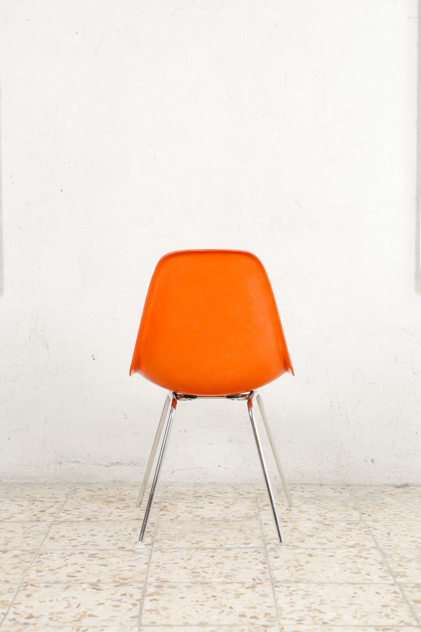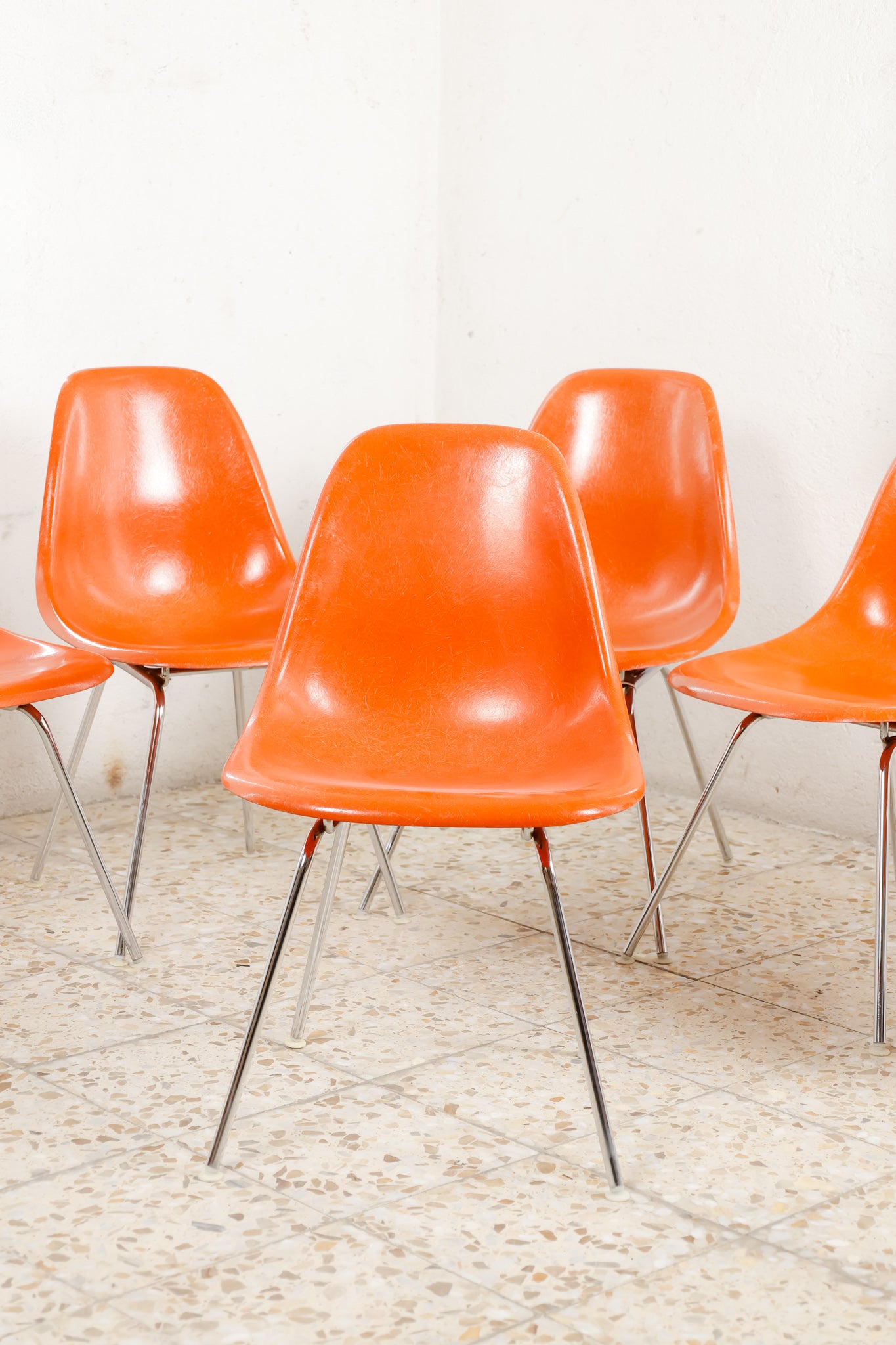 The Herman Miller DSX chairs are crafted in molded fiberglass and available in a orange finish, offering a timeless blend of texture, durability, and classic mid-century style. 4-legged chromed base.