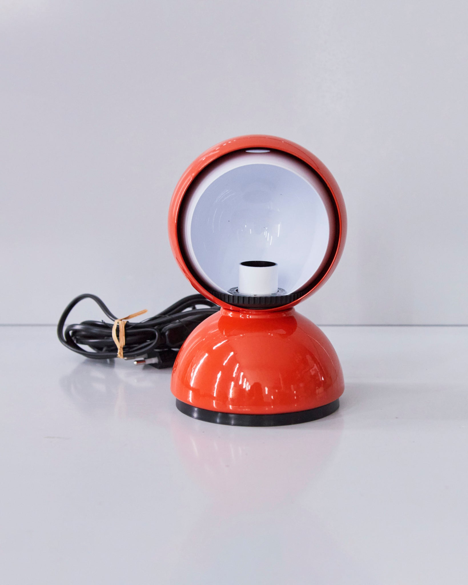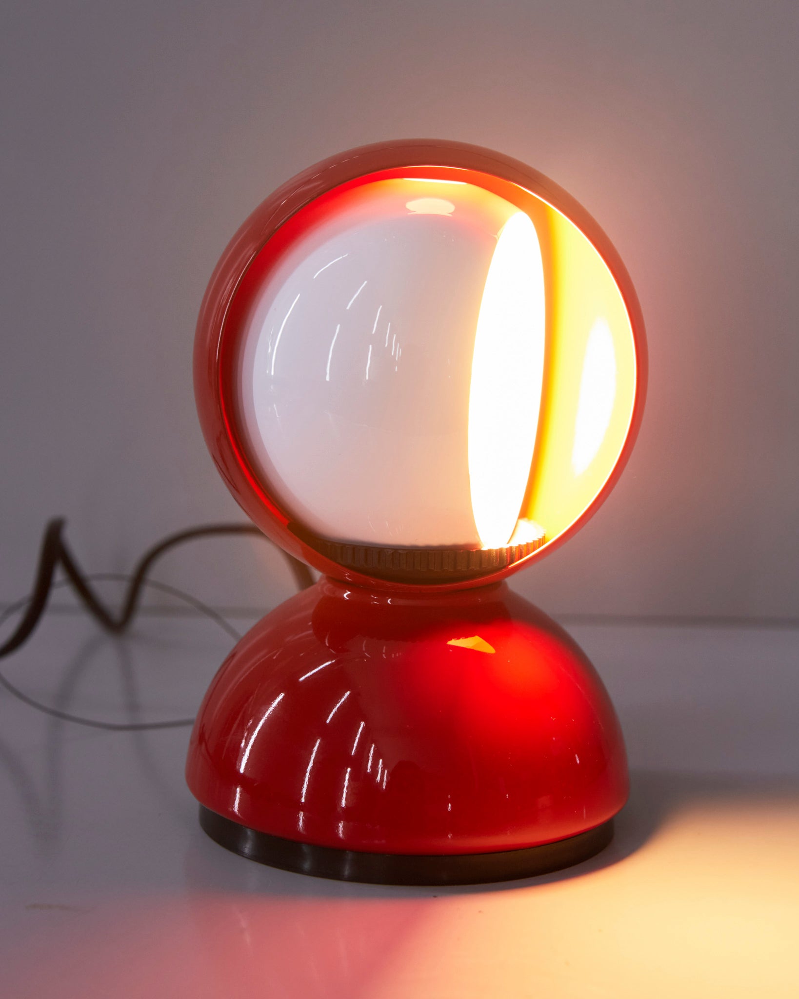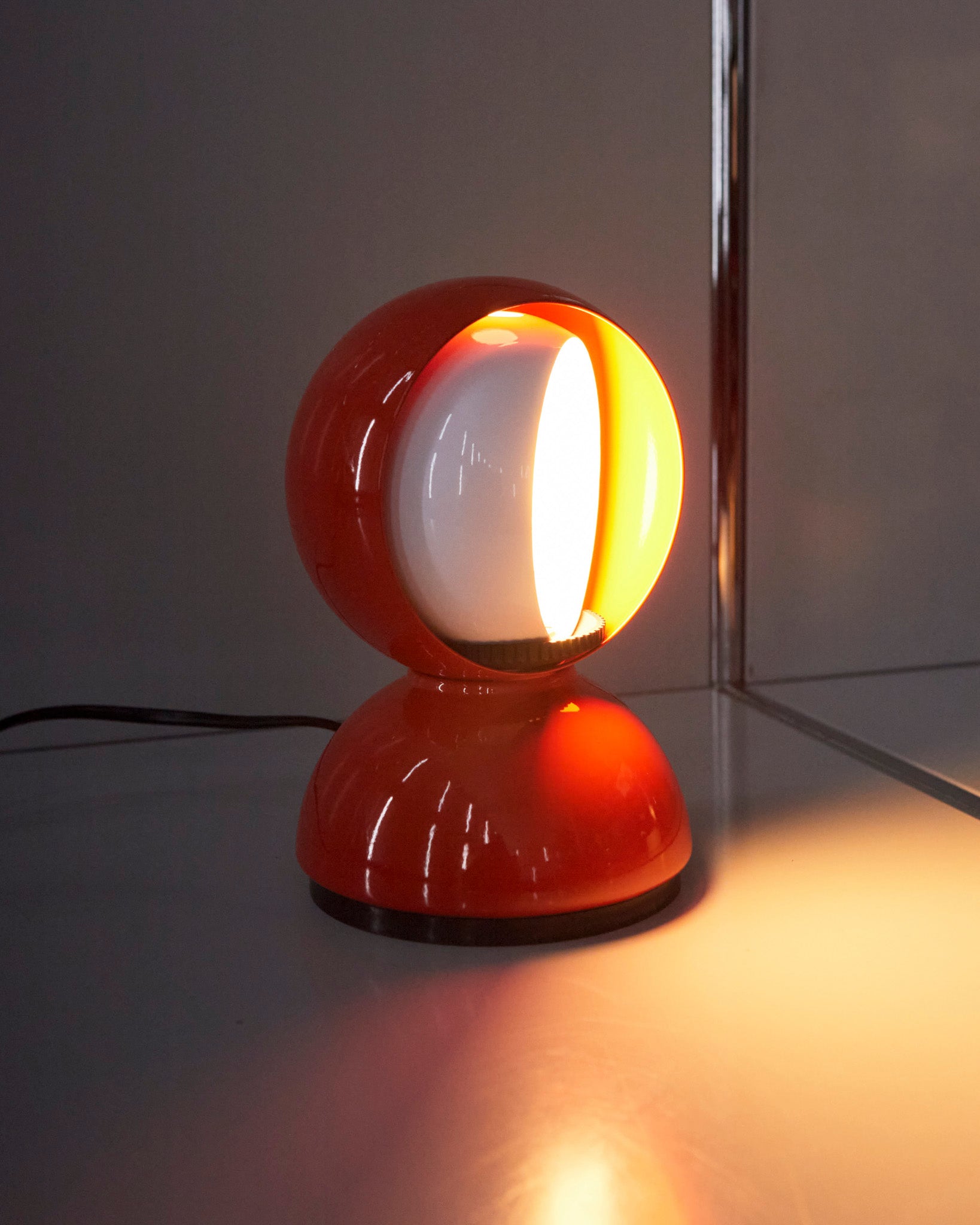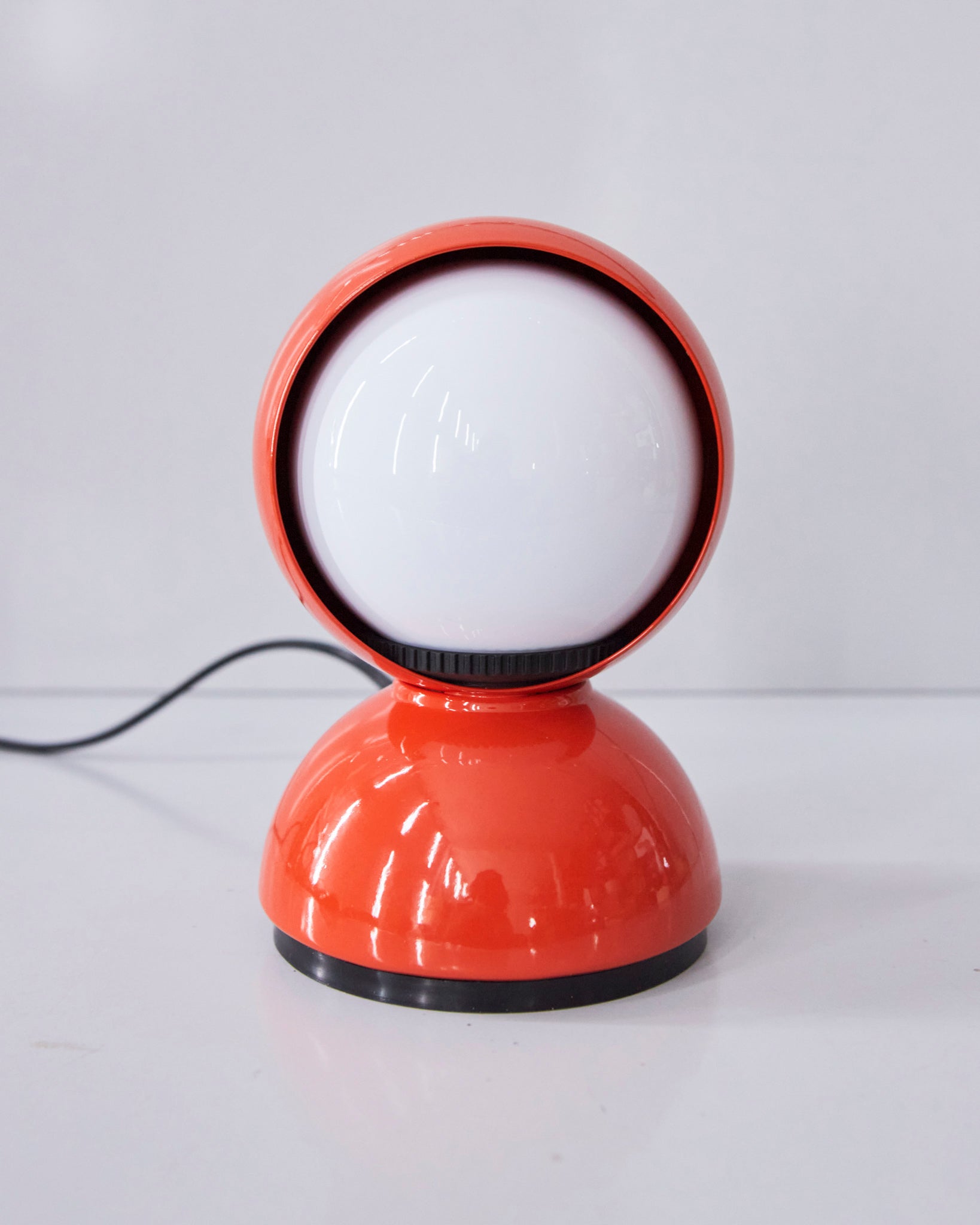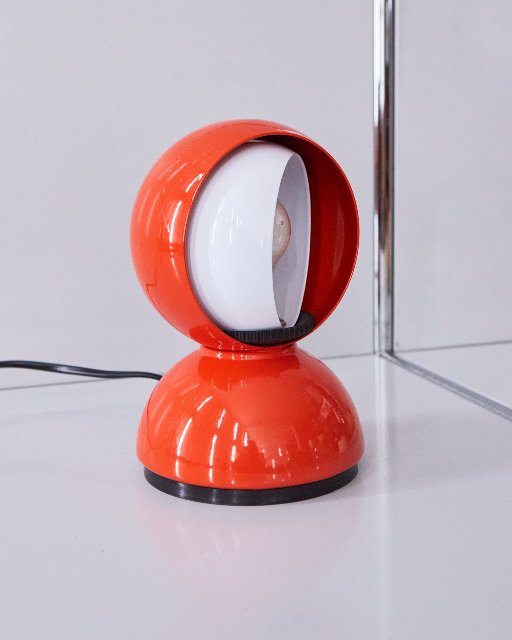 An Italian design icon awarded the Compasso d’Oro in 1967. Its genius lies in a rotating inner shade that allows the user to “eclipse” the light source, adjusting between direct and diffused illumination. Composed of overlapping hemispheres with a fixed outer shell and a movable inner shell, it can be used as a table or wall lamp. It is available in multiple finishes including classic painted metal colours and premium PVD options.
