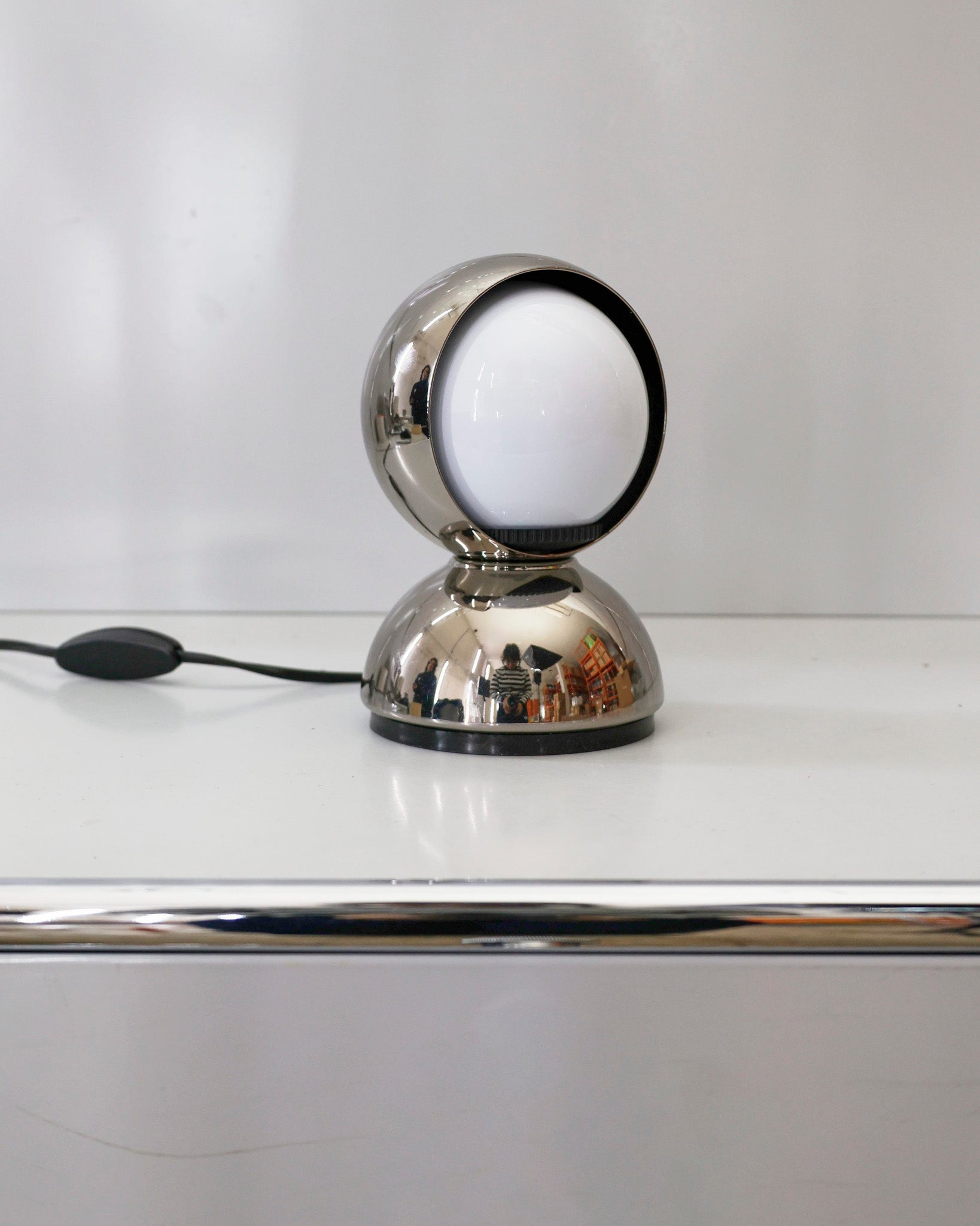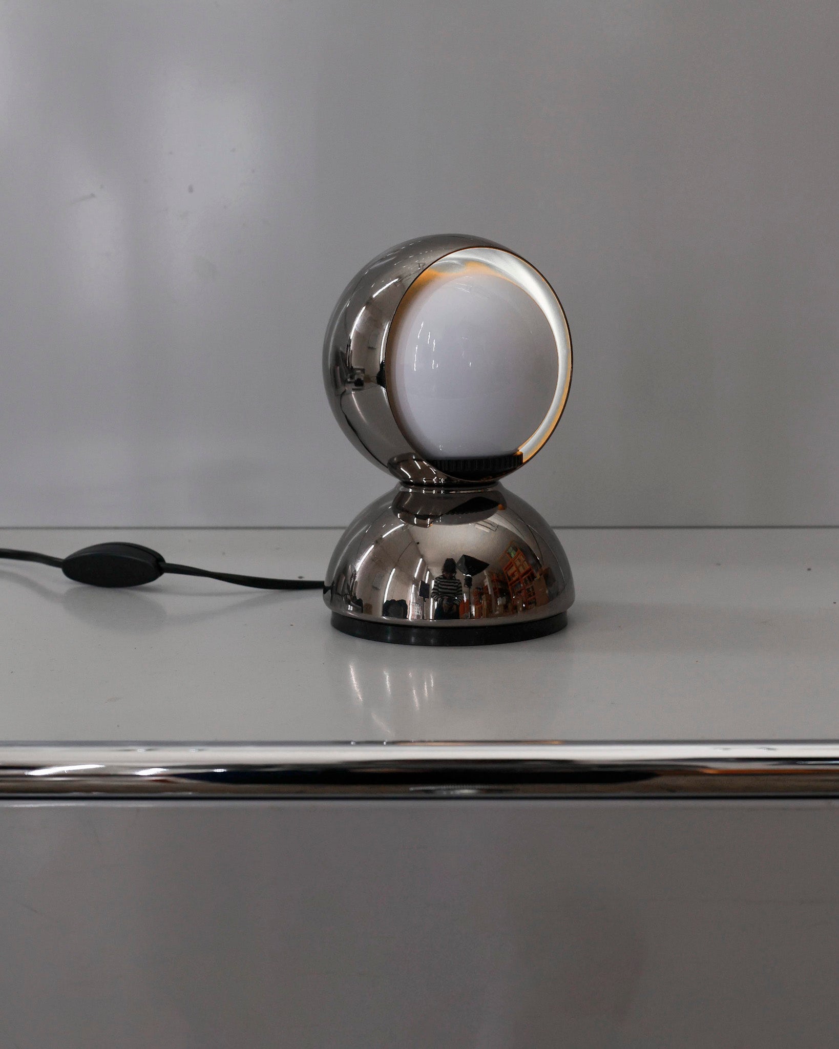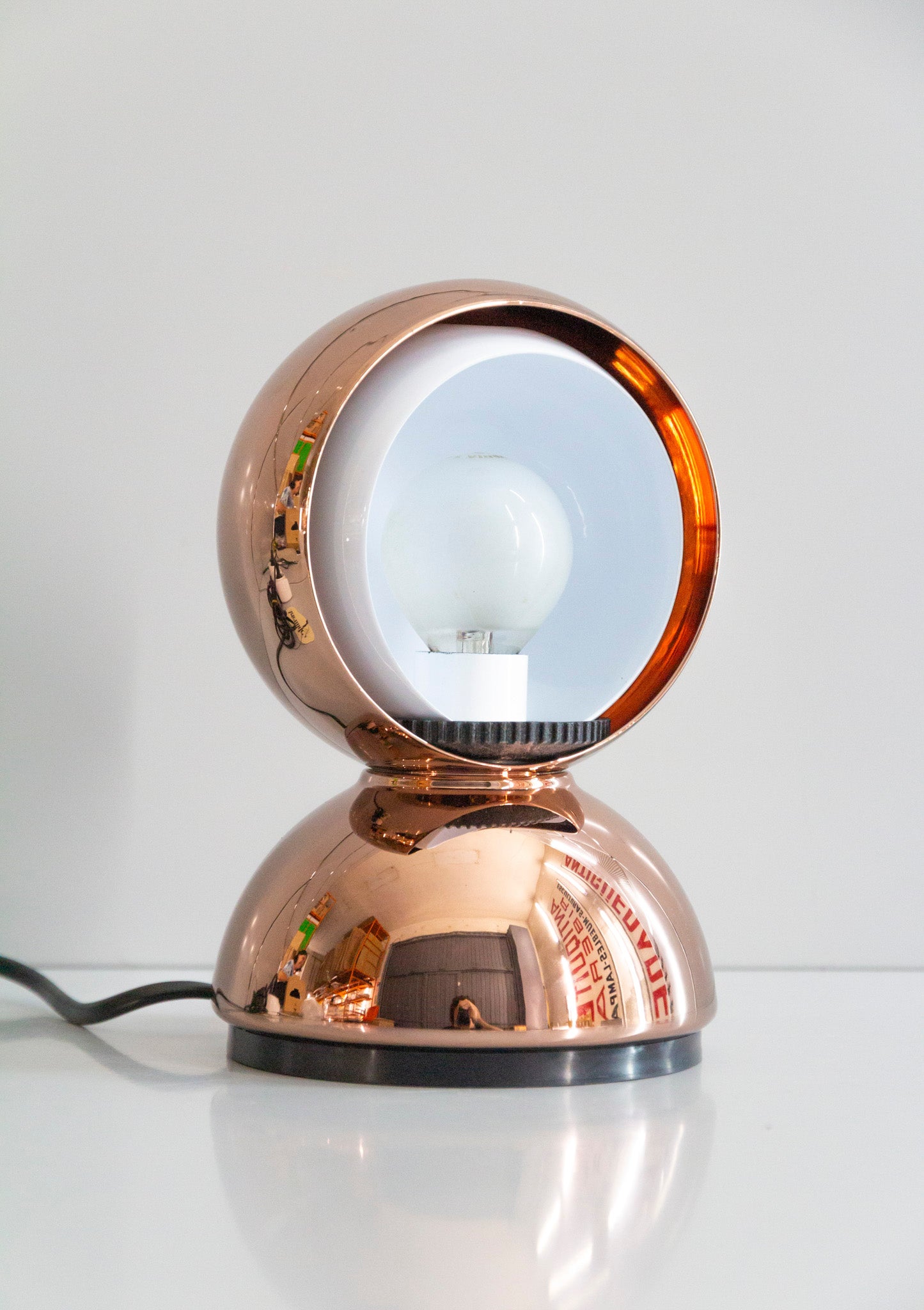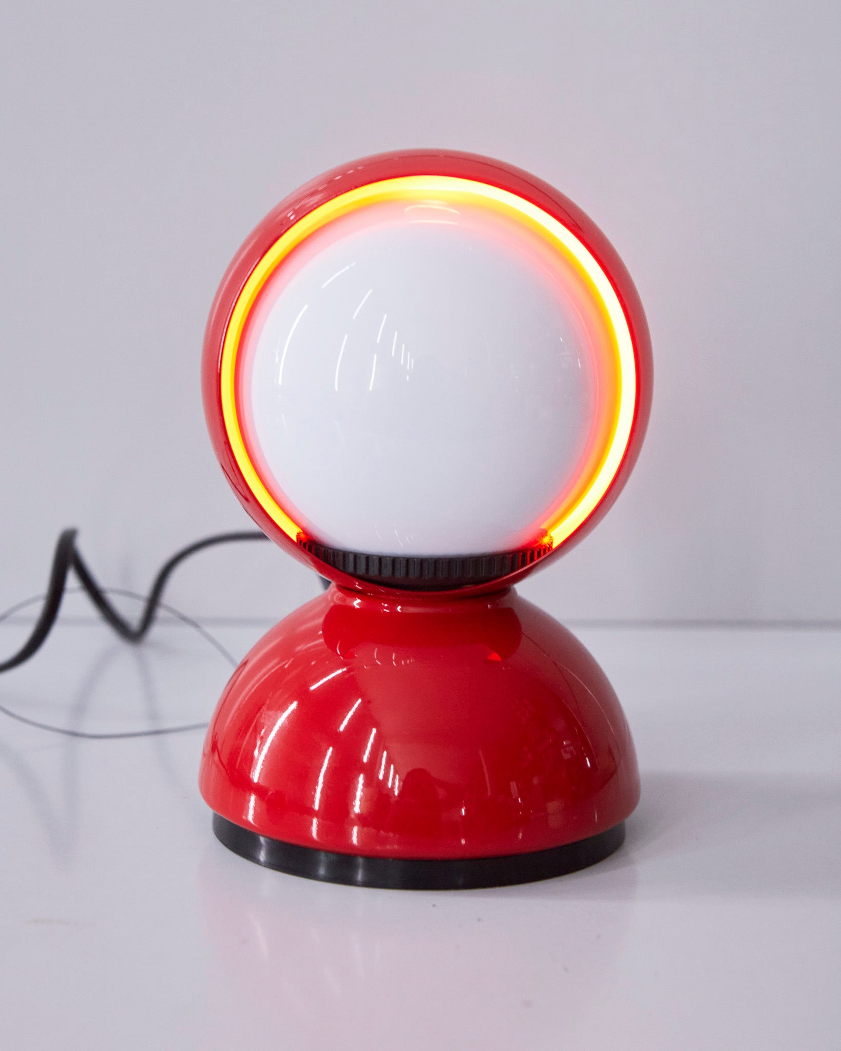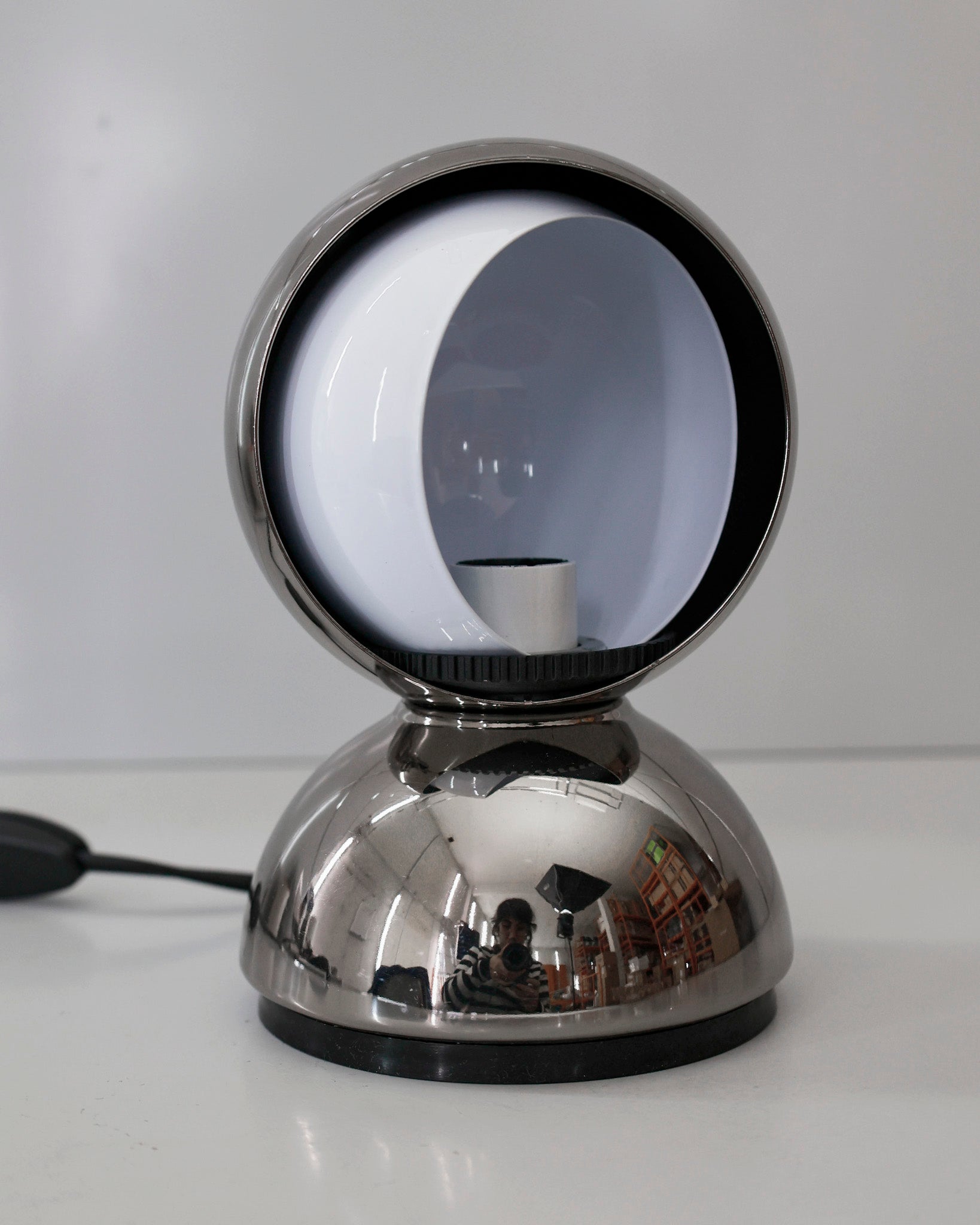 An Italian design icon awarded the Compasso d’Oro in 1967. Its genius lies in a rotating inner shade that allows the user to “eclipse” the light source, adjusting between direct and diffused illumination. Composed of overlapping hemispheres with a fixed outer shell and a movable inner shell, it can be used as a table or wall lamp. It is available in multiple finishes including classic painted metal colours and premium PVD options.