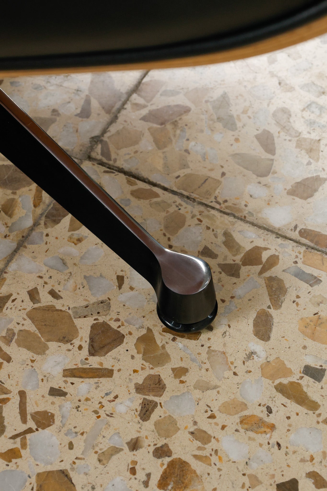 | Materials | Cherry plywood veneer seat and back shells, deep black leather cover, four-star non-swivel base in black coated steel with upper polished edges. |