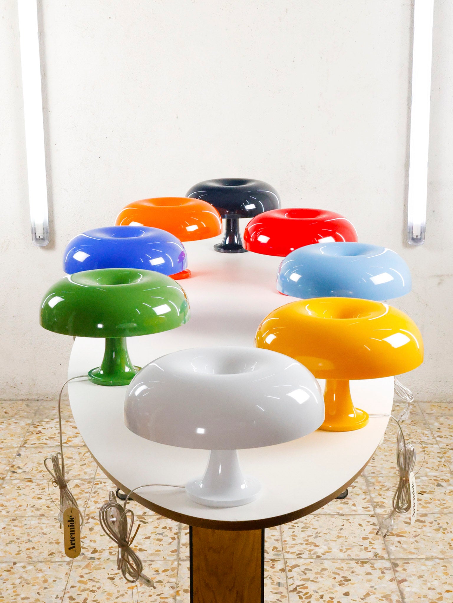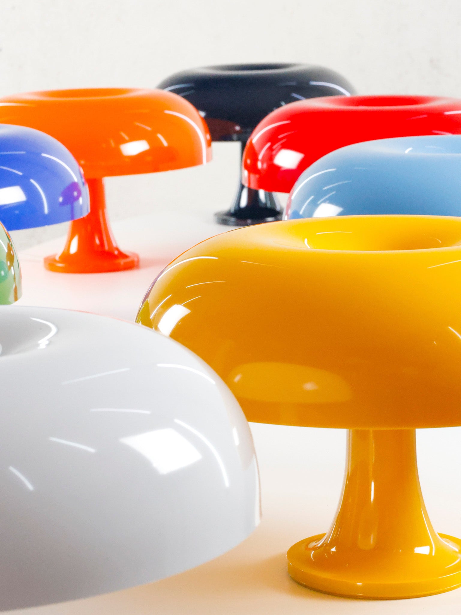 The Nessino Table Lamp, designed by Giancarlo Mattioli 1960s, is a modern classic reissued by Artemide. Its molded ABS body and mushroom-shaped diffuser reflect a futuristic yet friendly aesthetic, blending organic curves and vibrant color to bring warmth and character to interiors. A true icon of its era.